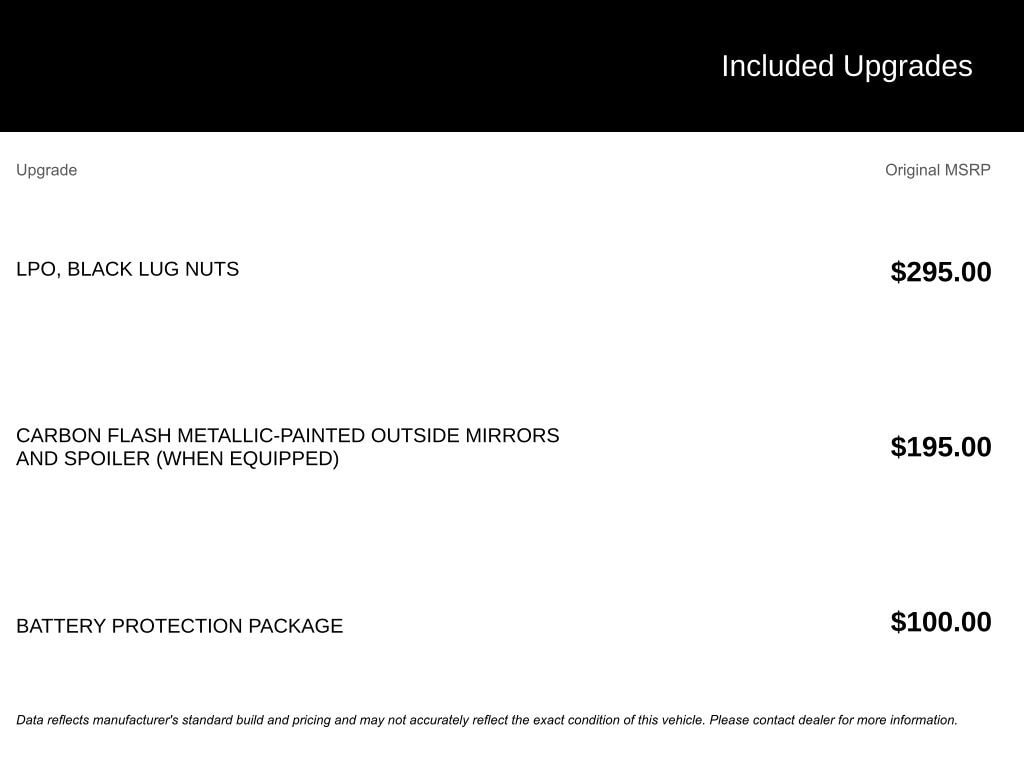 - Available in Carbon Flash Metallic by ordering Carbon Flash Metallic-painted outside mirrors and spoiler
