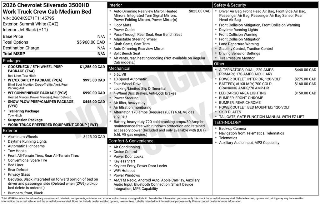 Whether you're hauling heavy loads, navigating rough terrain, or simply commuting to the job site, the 2026 Chevrolet Silverado 3500HD Work Truck is the perfect tool for the task. Experience the power, capability, and versatility that this exceptional truck has to offer. Visit our showroom today and let us demonstrate how this Silverado can elevate your workday. Tax, title, license and fees extra. Not all rebates are applicable to all customers. Contact dealer for details.$500 - Chevrolet Consumer Cash Program. Exp. 03/31/2026