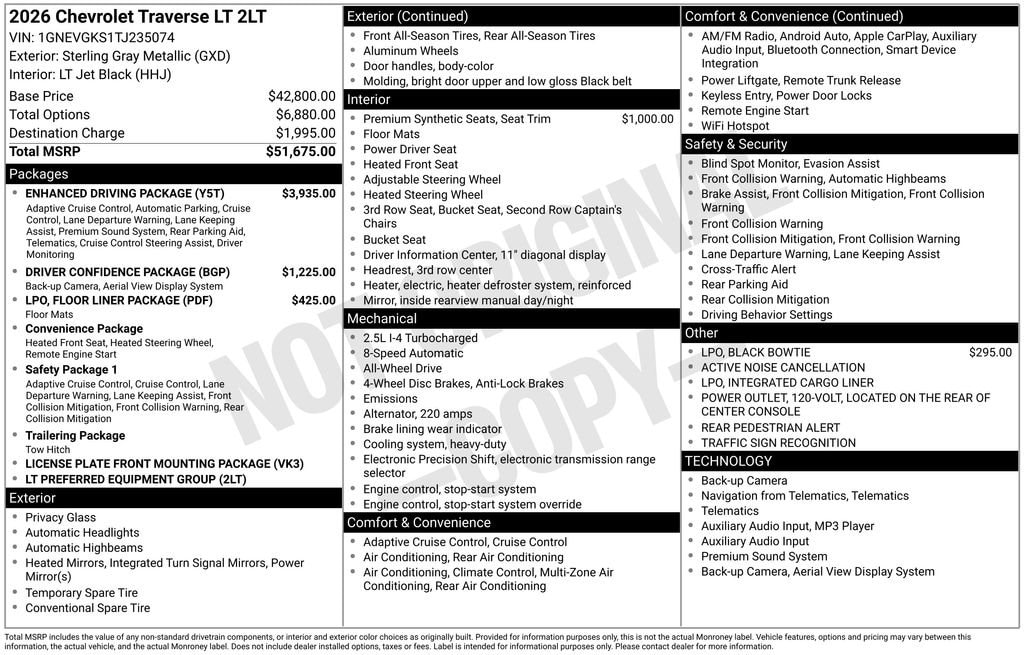 Discover the exceptional 2026 Chevrolet Traverse LT 2LT, a versatile and sophisticated SUV that seamlessly blends style, performance, and cutting-edge technology. This stunning Gray Traverse is equipped with a powerful 2.5L DOHC engine and an 8-speed automatic transmission, delivering a smooth and efficient all-wheel-drive driving experience.Highlighted features include: Navigation System Driver Confidence Package Enhanced Driving Package Floor Liner Package Preferred Equipment Group 2LT Bose Premium 12-Speaker Audio System Super Cruise HD Surround Vision Heated Steering Wheel Rear Pedestrian Alert Traffic Sign RecognitionIndulge in the comfort and convenience of this well-appointed Traverse, which offers a suite of premium amenities. Enjoy the dual-zone automatic climate control, power driver's seat, and Bose premium audio system, creating an exceptional driving environment. The hands-free power liftgate and all-weather floor liners add to the vehicle's versatility, making it the perfect companion for your active lifestyle.Safety is a top priority, and the Traverse LT 2LT delivers with advanced features like Automatic Emergency Braking, Lane Keep Assist, and Rear Cross-Traffic Alert. The OnStar emergency communication system provides added peace of mind, ensuring you and your loved ones are well-protected on the road.Designed to impress, the Traverse LT 2LT boasts a striking exterior with 18-inch Grazen Metallic Machined-Face Aluminum wheels and a sleek, aerodynamic profile. The interior is equally impressive, with premium cloth seating, a heated steering wheel, and a user-friendly infotainment system with Apple CarPlay and Android Auto integration.Experience the exceptional 2026 Chevrolet Traverse LT 2LT for yourself. This SUV is the perfect blend of style, performance, and technology, making it an ideal choice for those seeking a versatile and refined vehicle. Visit our showroom today to take a closer look and discover why the Traverse LT 2LT should be your next automotive adventure.