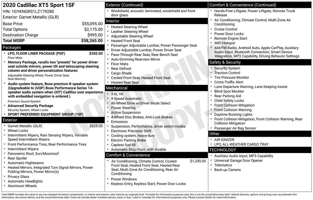 2-Way Power Driver Lumbar Control Seat Adjuster, 2-Way Power Passenger Lumbar Control Seat Adjuster, 3.49 Axle Ratio, 4-Wheel Disc Brakes, 8 Speakers, ABS brakes, Adaptive suspension, Air Conditioning, Air Ionizer, All-Weather Cargo Tray (LPO), Alloy wheels, AM/FM radio: SiriusXM, Apple CarPlay/Android Auto, Audio memory, Auto High-beam Headlights, Auto-dimming door mirrors, Auto-dimming Rear-View mirror, Automatic Dual-Zone Climate Control, Automatic Emergency Braking, Automatic temperature control, Bodyside moldings, Bose Premium 8-Speaker Audio System Feature, Brake assist, Bumpers: body-color, Compass, Delay-off headlights, Driver door bin, Driver vanity mirror, Dual Driver Info Center Display Gauge Cluster, Dual front impact airbags, Dual front side impact airbags, Electronic Stability Control, Emergency communication system: OnStar and Cadillac connected services capable, Exterior Parking Camera Rear, Floor Liner Package (LPO), Four wheel independent suspension, Front & Rear All-Weather Floor Liners (LPO), Front & Rear Park Assist, Front anti-roll bar, Front Bucket Seats, Front Center Armrest, Front dual zone A/C, Front reading lights, Fully automatic headlights, Garage door transmitter, HD Rear Vision Camera, Heated door mirrors, Heated Driver & Front Passenger Seats, Heated front seats, Heated Rear Outboard Seating Positions, Heated steering wheel, Illuminated entry, Inside Rear-View Auto-Dimming Mirror, Knee airbag, Leather Seating Surfaces w/Mini Perforated Inserts, Leather steering wheel, Low tire pressure warning, Memory seat, Occupant sensing airbag, Outside temperature display, Overhead airbag, Overhead console, Panic alarm, Passenger door bin, Passenger vanity mirror, Performance Suspension, Power door mirrors, Power driver seat, Power Liftgate, Power moonroof: UltraView, Power passenger seat, Power steering, Power windows, Radio data system, Radio: Cadillac User Experience AM/FM Stereo, Rain sensing wipers, Rear anti-roll bar, Rear reading lights, Rear seat center armrest, Rear window defroster, Rear window wiper, Remote keyless entry, Security system, SiriusXM w/360L, Speed control, Speed-sensing steering, Split folding rear seat, Spoiler, Sport Package 1SF, Steering wheel memory, Steering wheel mounted audio controls, Tachometer, Teen Driver, Telescoping steering wheel, Tilt steering wheel, Traction control, Tri-Zone Automatic Climate Control, Trip computer, Turn signal indicator mirrors, Variably intermittent wipers, Ventilated Driver & Front Passenger Seats, Voltmeter, Wheels: 20 12-Spoke Alloy w/Pearl Nickel Finish.