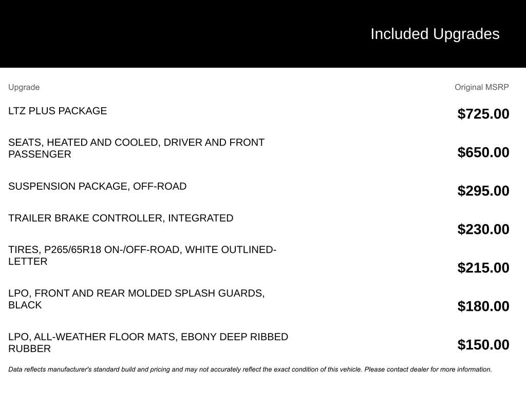 *HEATED SEATS, *TOW PACKAGE/TRAILER HITCH, *REMOTE START, *4X4 / 4WD, *TRAILER BRAKE CONTROLLER, *INSERT BED LINER, *POWER DRIVER'S SEAT, *POWER PASSENGER'S SEAT, *LEATHER SEATS, *VENTILATED / COOLED SEATS, *ASSIST STEPS / RUNNING BOARDS, *TONNEAU COVER, *POWER ADJUSTABLE PEDALS, *REAR PARK ASSIST, *FOG LIGHTS, *UNIVERSAL HOME REMOTE / GARAGE DOOR OPENER, *ONSTAR, *ALLOY WHEELS, *18 INCH WHEELS, 6-Speed Automatic Electronic with Overdrive, 4WD, Ebony Leather, 10-Way Power Driver's Seat Adjuster, 10-Way Power Front Passenger Seat Adjuster, 18 x 8 Aluminum Wheels, 18 x 8 Chrome-Clad Aluminum Wheels, 7 Speakers, ABS brakes, Air Conditioning, Alloy wheels, AM/FM radio: SiriusXM, AM/FM Stereo w/CD Player & MP3 Playback, Auto-dimming door mirrors, Auto-dimming Rear-View mirror, Automatic temperature control, Bluetooth® For Phone, Body-Colored Bodyside Moldings, Body-Colored Grille w/Unique Chrome Insert, Body-Colored Power Heated Outside Rear-View Mirrors, Bodyside moldings, Bose Premium Audio Speaker System, Bumpers: body-color, CD player, Color-Keyed Carpeting w/Rubberized Vinyl Floormats, Color-Keyed Door Handles, Compass, Delay-off headlights, Driver & Front Passenger Illuminated Visor Mirrors, Driver door bin, Driver vanity mirror, Dual front impact airbags, Dual front side impact airbags, Dual-Zone Automatic Climate Control, Ebony Deep Ribbed Rubber All-Weather Mats, Electric Rear-Window Defogger, Electronic Autotrac Transfer Case, Electronic Stability Control, Emergency communication system: OnStar Directions & Connections, EZ-Lift Tailgate, Floor Console w/Dual Cup Holders, Front & Rear Molded Splash Guards, Front anti-roll bar, Front Bucket Seats, Front Center Armrest, Front dual zone A/C, Front fog lights, Front Full-Feature Bucket Seats, Front Halogen Fog Lamps, Front reading lights, Front wheel independent suspension, Fully automatic headlights, Heated & Cooled Driver & Front Passenger Seats, Heated door mirrors, Heated front seats, Heavy Duty Cooling Package, Heavy-Duty Air-to-Oil External Engine Oil Cooler, Heavy-Duty Auxiliary External Transmission Oil Cooler, Heavy-Duty Handling/Trailering Suspension Package, Heavy-Duty Rear Automatic Locking Differential, Heavy-Duty Trailering Package, Illuminated entry, Inside Auto-Dimming Rear-View Mirror, Integrated Trailer Brake Controller, Leather-Appointed Front Seat Trim, Leather-Wrapped Steering Wheel, Locking Tailgate, Low tire pressure warning, LTZ Equipment Group, LTZ Plus Package, Memory seat, Occupant sensing airbag, Off-Road Suspension Package, Outside temperature display, Overhead airbag, Overhead console, Panic alarm, Passenger door bin, Passenger vanity mirror, Power Door Locks w/Remote Keyless Entry, Power door mirrors, Power driver seat, Power passenger seat, Power steering, Power windows, Power Windows w/Driver & Front Passenger Express-Down, Power-Adjustable Pedals For Accelerator & Brake, Radio data system, Rear reading lights, Rear seat center armrest, Rear step bumper, Rear Wheelhouse Liner, Rear window defroster, Remote keyless entry, Remote Keyless Entry w/2 Transmitters, Remote Vehicle Starter System, Security system, SIRIUSXM Satellite Radio, Skid Plate Package, Solar-Ray Deep-Tinted Glass, Speed control, Split folding rear seat, Steering Wheel Mounted Audio Controls, Steering wheel mounted audio controls, Tachometer, Tilt steering wheel, Traction control, Trip computer, Turn signal indicator mirrors, Ultrasonic Rear Parking Assist w/Audible Warning, Universal Home Remote, Variably intermittent wipers, Voltmeter, 6-Speed Automatic Electronic with Overdrive, 4WD, Ebony Leather.