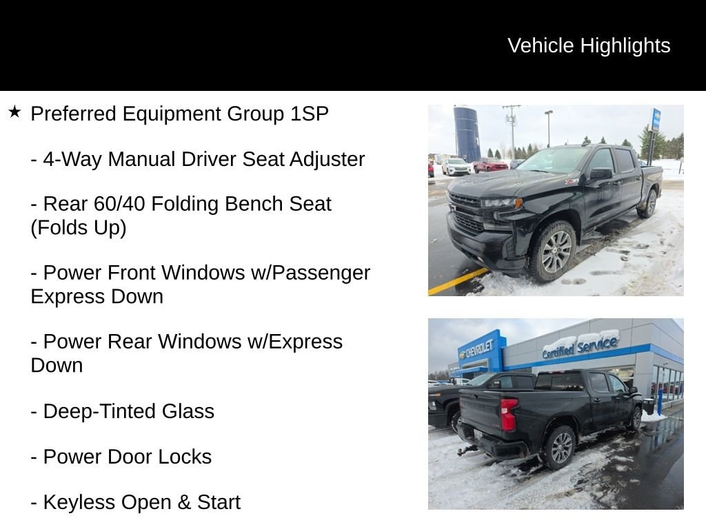 *HEATED SEATS, *TOW PACKAGE/TRAILER HITCH, *REMOTE START, *4X4 / 4WD, *Z71 OFF ROAD PACKAGE, *TRAILER BRAKE CONTROLLER, *SPRAY IN BED LINER, *HEATED STEERING WHEEL, *POWER DRIVER'S SEAT, *REAR VISION BACK UP CAMERA, *FOG LIGHTS, *UNIVERSAL HOME REMOTE / GARAGE DOOR OPENER, *BOSE PREMIUM SOUND SYSTEM, *ONSTAR, *ALLOY WHEELS, *20 INCH WHEELS, *CARFAX 1-OWNER, 8-Speed Automatic, 4WD, Black Cloth, 10-Way Power Driver Seat w/Lumbar, 12-Volt Rear Auxiliary Power Outlet, 120-Volt Instrument Panel Power Outlet, 2 USB Ports, 2 USB Ports (First Row), 4-Way Manual Driver Seat Adjuster, 4.2 Diagonal Color Display Driver Info Center, 6-Speaker Audio System, All-Star Edition, All-Weather Floor Liner (LPO) (AAK), Bed Protection Package, Bluetooth® For Phone, Body Color Grille, Color-Keyed Carpeting Floor Covering, Compass, Convenience Package, Convenience Package II, Convenience Package w/Buckets Seats, Deep-Tinted Glass, Dual Exhaust w/Polished Outlets, Dual-Zone Automatic Climate Control, Electric Rear-Window Defogger, Electrical Lock Control Steering Column, Floor Mounted Center Console, Front Bucket Seats, Front Frame-Mounted Black Recovery Hooks, Front LED Fog Lamps, Front Rubberized Vinyl Floor Mats, HD Radio, HD Rear Vision Camera, Heated Driver & Front Outboard Passenger Seats, Heated Steering Wheel, Heavy-Duty Rear Locking Differential, High Capacity Air Filter, High Gloss Black Mirror Caps, Hill Descent Control, Keyless Open & Start, Leather Wrapped Steering Wheel, LED Cargo Area Lighting, Manual Tilt-Wheel Steering Column, Manual Tilt/Telescoping Steering Column, Off-Road Suspension, OnStar & Chevrolet Connected Services Capable, Power Door Locks, Power Front Windows w/Driver Express Up/Down, Power Front Windows w/Passenger Express Down, Power Rear Windows w/Express Down, Power Sliding Rear Window w/Rear Defogger, Preferred Equipment Group 1SP, Premium Bose 7-Speaker Sound System, Radio: Chevrolet Infotainment 3 Plus System, Rear 60/40 Folding Bench Seat (Folds Up), Rear Dual USB Charging-Only Ports, Rear Rubberized-Vinyl Floor Mats, Rear Vision Camera, Remote Vehicle Starter System, Single-Zone Manual/Semi-Automatic Air Conditioning, SiriusXM w/360L, Steering Wheel Audio Controls, Steering Wheel Mounted Electronic Cruise Control, Theft Deterrent System (Unauthorized Entry), Trailering Package, Universal Home Remote, Urethane Steering Wheel, Z71 Off-Road & Protection Package, Z71 Off-Road Package, 120-Volt Bed Mounted Power Outlet, 170 Amps Alternator, 220 Amps Alternator, 3.23 Rear Axle Ratio, 4-Wheel Disc Brakes, 40/20/40 Front Split-Bench Seat, 4G LTE Wi-Fi Hot Spot Capable, 6 Speakers, ABS brakes, Air Conditioning, Alloy wheels, Apple CarPlay/Android Auto, Auxiliary External Transmission Oil Cooler, Brake assist, Bumpers: body-color, Chevrolet Connected Access Capable, Chevytec Spray-On Black Bedliner, Cloth Rear Seat w/Storage Package, Cloth Seat Trim, Delay-off headlights, Driver door bin, Driver vanity mirror, Dual front impact airbags, Dual front side impact airbags, Electronic Stability Control, External Engine Oil Cooler, Front anti-roll bar, Front Center Armrest w/Storage, Front fog lights, Front reading lights, Front wheel independent suspension, Fully automatic headlights, Heated door mirrors, Heavy Duty Suspension, Hitch Guidance, Illuminated entry, Integrated Trailer Brake Controller, Low tire pressure warning, Occupant sensing airbag, Outside temperature display, Overhead airbag, Overhead console, Panic alarm, Passenger door bin, Passenger vanity mirror, Power door mirrors, Power steering, Power windows, Radio data system, Radio: Chevrolet Infotainment 3 System, Rear reading lights, Rear step bumper, Rear Wheelhouse Liners, Rear window defroster, Remote keyless entry, Security system, Speed control, Speed-sensing steering, Split folding rear seat, Steering wheel mounted audio controls, Tachometer, Tilt steering wheel, Tracti