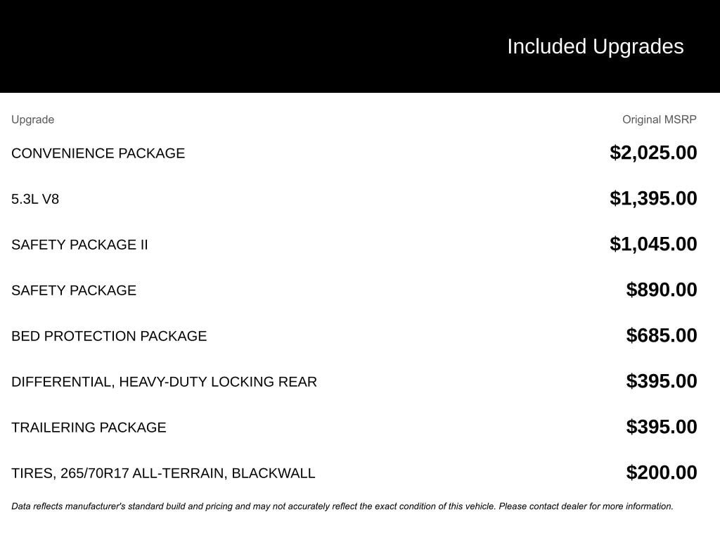*HEATED SEATS, *REMOTE START, *4X4 / 4WD, *TRAILER BRAKE CONTROLLER, *SPRAY IN BED LINER, *HEATED STEERING WHEEL, *POWER DRIVER'S SEAT, *ADAPTIVE CRUISE CONTROL, *REAR VISION BACK UP CAMERA, *REAR PARK ASSIST, *FRONT & REAR PARK ASSIST, *SIDE BLIND ZONE ALERT, *REAR CROSS TRAFFIC ALERT, *LANE DEPARTURE WARNING, *LANE KEEP ASSIST, *FORWARD COLLISION ALERT, *ONSTAR, *ALLOY WHEELS, *17 INCH WHEELS, *CARFAX 1-OWNER, *CARFAX CLEAN VEHICLE HISTORY, 8-Speed Automatic, 4WD, Black Cloth, 10-Way Power Driver Seat w/Lumbar, 12-Volt Rear Auxiliary Power Outlet, 2 USB Ports (First Row), 4-Way Manual Driver Seat Adjuster, 4.2 Diagonal Color Display Driver Info Center, 40/20/40 Front Split-Bench Seat, Bluetooth® For Phone, Chrome Grille, Chrome Mirror Caps, Color-Keyed Carpeting Floor Covering, Compass, Convenience Package, Deep-Tinted Glass, Dual-Zone Automatic Climate Control, Electric Rear-Window Defogger, Electrical Lock Control Steering Column, EZ Lift Power Lock & Release Tailgate, Front Frame-Mounted Black Recovery Hooks, Front Rubberized Vinyl Floor Mats, Heated Driver & Front Outboard Passenger Seats, Heated Steering Wheel, Keyless Open & Start, Lane Change Alert w/Side Blind Zone Alert, Leather Wrapped Steering Wheel, LED Cargo Area Lighting, Locking Tailgate, Manual Tilt-Wheel Steering Column, Manual Tilt/Telescoping Steering Column, OnStar & Chevrolet Connected Services Capable, Perimeter Lighting, Power Door Locks, Power Front Windows w/Driver Express Up/Down, Power Front Windows w/Passenger Express Down, Power Rear Windows w/Express Down, Preferred Equipment Group 1LT, Rear 60/40 Folding Bench Seat (Folds Up), Rear Cross Traffic Alert, Rear Dual USB Charging-Only Ports, Rear Rubberized-Vinyl Floor Mats, Rear Vision Camera, Remote Keyless Entry, Remote Vehicle Starter System, Safety Package, Single-Zone Manual/Semi-Automatic Air Conditioning, Steering Wheel Audio Controls, Steering Wheel Mounted Electronic Cruise Control, Ultrasonic Front & Rear Park Assist, Urethane Steering Wheel, 170 Amps Alternator, 220 Amps Alternator, 3.23 Rear Axle Ratio, 4-Wheel Disc Brakes, 40/20/40 Front Split Bench Seat, 4G LTE Wi-Fi Hot Spot Capable, 6 Speakers, ABS brakes, Air Conditioning, Alloy wheels, Apple CarPlay/Android Auto, Auxiliary External Transmission Oil Cooler, Bed Protection Package, Brake assist, Bumpers: chrome, Chevrolet Connected Access Capable, Chevytec Spray-On Black Bedliner, Cloth Seat Trim, Delay-off headlights, Driver door bin, Driver vanity mirror, Dual front impact airbags, Dual front side impact airbags, Electronic Stability Control, External Engine Oil Cooler, Front anti-roll bar, Front Center Armrest w/Storage, Front reading lights, Front wheel independent suspension, Fully automatic headlights, Heated door mirrors, Heavy Duty Suspension, Heavy-Duty Rear Locking Differential, High Capacity Air Filter, Hitch Guidance, Illuminated entry, Low tire pressure warning, Occupant sensing airbag, Outside temperature display, Overhead airbag, Overhead console, Panic alarm, Passenger door bin, Passenger vanity mirror, Power door mirrors, Power steering, Power windows, Radio data system, Radio: Chevrolet Infotainment 3 System, Rear reading lights, Rear step bumper, Rear Wheelhouse Liners, Remote keyless entry, Speed control, Speed-sensing steering, Split folding rear seat, Steering wheel mounted audio controls, Tachometer, Theft Deterrent System (Unauthorized Entry), Tilt steering wheel, Traction control, Trailering Package, Trip computer, Variably intermittent wipers, Voltmeter, Wheels: 17 x 8 Bright Silver Painted Aluminum, Work Truck Package, 8-Speed Automatic, 4WD, Black Cloth, 10-Way Power Driver Seat w/Lumbar, 12-Volt Rear Auxiliary Power Outlet, 2 USB Ports (First Row), 4-Way Manual Driver Seat Adjuster, 4.2 Diagonal Color Display Driver Info Center, 40/20/40 Front Split-Bench Seat, Bluetooth® For Phone, Chrome Grille, Chrome Mirror Ca