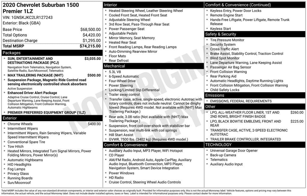 I was driving a Jeep Wrangler before this so I wasn’t used to all of the features this suburban came with. I have 3 kids so I need a lot of room and safety was a huge concern. This suv is AMAZING. I can’t say enough good things about it. The only thing I wish it had were the cool tail lights that the gmc comes with. Other than that it’s great.… - 5.0