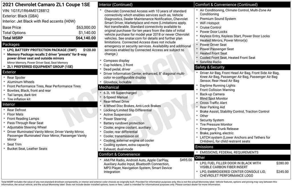 Used 2021 ChevroletCamaro ZL1