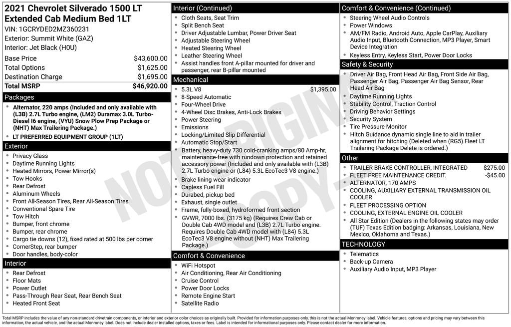 Discover the power and versatility of the 2021 Chevrolet Silverado 1500 LT LT1. This exceptional full-size pickup is ready to take on any challenge, whether you're hauling heavy loads, towing a trailer, or simply enjoying the open road.Equipped with a robust 5.3L EcoTec3 V8 engine, the Silverado 1500 LT LT1 delivers exceptional performance and efficiency. Boasting features such as -- Heated seats- Tow package with trailer hitch- Remote start- 4x4 capability- Trailer brake controller- Heated steering wheel- Power driver's seat- Rear vision camera- Rear park assist- Navigation- OnStarThe Silverado's advanced technology and convenience features ensure a seamless, comfortable driving experience. Enjoy the convenience of dual-zone automatic climate control, keyless open and start, and the Chevrolet Infotainment 3 system with SiriusXM radio and Bluetooth connectivity.This Silverado also comes equipped with the Trailering Package, Convenience Package, and Preferred Equipment Group 1LT, providing you with a comprehensive suite of capabilities. The integrated trailer brake controller, 4.2-inch color driver information center, and chrome exterior accents add both functionality and style.Safety is a top priority, with features like electronic stability control, 4-wheel disc brakes with ABS, and a suite of airbags providing you and your passengers with peace of mind on the road.Boasting a spacious and well-appointed interior, the Silverado 1500 LT LT1 offers ample room for both passengers and cargo. The 60/40 split-folding rear bench seat and available power driver's seat ensure comfortable seating for all.Whether you're tackling tough jobs or seeking a capable and versatile daily driver, the 2021 Chevrolet Silverado 1500 LT LT1 is the perfect choice. Experience the power, technology, and refined design that make this truck a standout in its class. Visit our showroom today and let us demonstrate how this Silverado can enhance your driving experience.