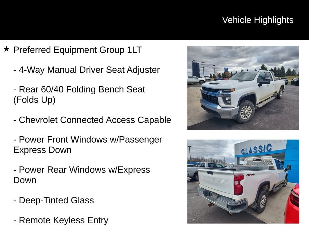 *4X4 / 4WD, *TRAILER BRAKE CONTROLLER, *SPRAY IN BED LINER, *HD REAR VISION BACK UP CAMERA, *REAR PARK ASSIST, *ONSTAR, *ALLOY WHEELS, *CARFAX 1-OWNER, *CARFAX CLEAN VEHICLE HISTORY, 6-Speed Automatic, 4WD, Black Cloth, 170 Amp Alternator, 2 USB Ports (1st Row), 2-Speed Electronic Shift Transfer Case, 4-Way Manual Driver Seat Adjuster, 4.2 Diagonal Color Display DIC, 4G LTE Wi-Fi Hotspot Capable, Black Mirror Caps, Bluetooth® For Phone, Chevrolet Connected Access Capable, Chrome Front Grille, Color-Keyed Carpeting Floor Covering, Compass, Deep-Tinted Glass, Electronic Cruise Control w/Set & Resume Speed, Front Rubberized Vinyl Floor Mats, Halogen Reflector Headlamps, Heated Vertical Trailering Mirrors, Integrated Trailer Brake Controller, Manual Tailgate Function w/EZ Lift, Manual Tilt-Wheel Steering Column, OnStar & Chevrolet Connected Services Capable, Power Door Locks, Power Front Windows w/Driver Express Up/Down, Power Front Windows w/Passenger Express Down, Power Rear Windows w/Express Down, Preferred Equipment Group 1LT, Rear 60/40 Folding Bench Seat (Folds Up), Rear Rubberized Vinyl Floor Mats, Rear Vision Camera, Remote Keyless Entry, SiriusXM Radio, Steering Wheel Audio Controls, Urethane Steering Wheel, 120-Volt Bed Mounted Power Outlet, 120-Volt Instrument Panel Power Outlet, 17 Machined Aluminum Wheels, 3.73 Rear Axle Ratio, 4-Wheel Disc Brakes, 6 Speakers, 6-Speaker Audio System, 6 Rectangular Black Tubular Assist Steps (LPO) (DISC), 720 Cold-Cranking Amps Heavy-Duty Battery, ABS brakes, Air Conditioning, Alloy wheels, AM/FM radio: SiriusXM, Apple CarPlay/Android Auto, Black Chevytec Spray-On Bedliner w/Chevrolet Logo, Black Molded Splash Guards (LPO), Brake assist, Bumpers: chrome, Cloth Seat Trim, Delay-off headlights, Driver door bin, Driver vanity mirror, Dual front impact airbags, Dual front side impact airbags, Electric Rear-Window Defogger, Electronic Stability Control, Front 40/20/40 Split-Bench Seat w/Storage, Front anti-roll bar, Front Center Armrest w/Storage, Front reading lights, Front wheel independent suspension, Fully automatic headlights, Heated door mirrors, Illuminated entry, Low tire pressure warning, Occupant sensing airbag, Outside temperature display, Overhead airbag, Overhead console, Panic alarm, Passenger door bin, Passenger vanity mirror, Power door mirrors, Power steering, Power windows, Premium audio system: Chevrolet Infotainment 3, Radio: Chevrolet Infotainment 3 System, Rear reading lights, Rear step bumper, Remote keyless entry, Speed control, Split folding rear seat, Steering wheel mounted audio controls, Suspension Package, Tachometer, Tilt steering wheel, Traction control, Trip computer, Turn signal indicator mirrors, Variably intermittent wipers, Voltmeter, 6-Speed Automatic, 4WD, Black Cloth, 170 Amp Alternator, 2 USB Ports (1st Row), 2-Speed Electronic Shift Transfer Case, 4-Way Manual Driver Seat Adjuster, 4.2 Diagonal Color Display DIC, 4G LTE Wi-Fi Hotspot Capable, Black Mirror Caps, Bluetooth® For Phone, Chevrolet Connected Access Capable, Chrome Front Grille, Color-Keyed Carpeting Floor Covering, Compass, Deep-Tinted Glass, Electronic Cruise Control w/Set & Resume Speed, Front Rubberized Vinyl Floor Mats, Halogen Reflector Headlamps, Heated Vertical Trailering Mirrors, Integrated Trailer Brake Controller, Manual Tailgate Function w/EZ Lift, Manual Tilt-Wheel Steering Column, OnStar & Chevrolet Connected Services Capable, Power Door Locks, Power Front Windows w/Driver Express Up/Down, Power Front Windows w/Passenger Express Down, Power Rear Windows w/Express Down, Preferred Equipment Group 1LT, Rear 60/40 Folding Bench Seat (Folds Up), Rear Rubberized Vinyl Floor Mats, Rear Vision Camera, Remote Keyless Entry, SiriusXM Radio, Steering Wheel Audio Controls, Urethane Steering Wheel.
