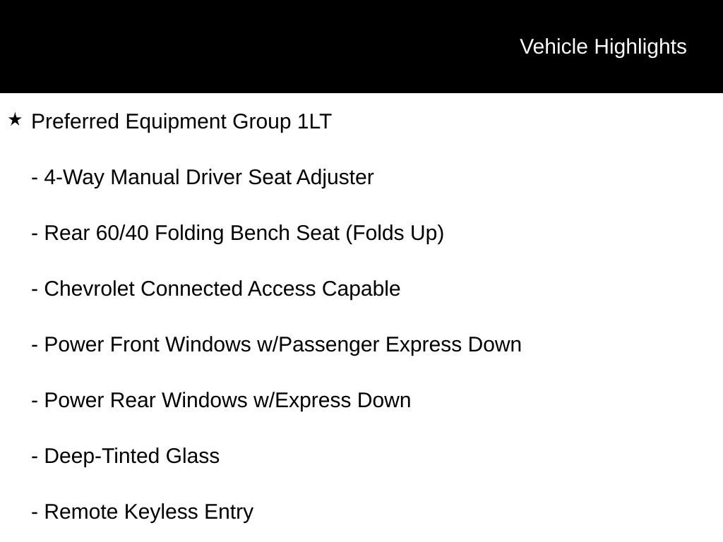 Stepping inside, you'll be greeted by a well-appointed interior that combines functionality and comfort. The Preferred Equipment Group 1LT package includes desirable amenities such as SiriusXM Radio, steering wheel audio controls, Bluetooth connectivity, and power windows with express up/down functionality.