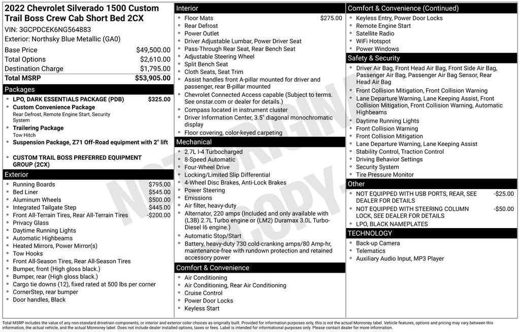 8-Speed Automatic, 4WD, Black Cloth, 10-Way Power Driver Seat w/Lumbar, 120-Volt Bed Mounted Power Outlet, 120-Volt Instrument Panel Power Outlet, 220 Amp Alternator, 3.42 Rear Axle Ratio, 3.5 Monochromatic Display Driver Info Center, 4-Wheel Disc Brakes, 4 Black Round Assist Steps (LPO), 40/20/40 Front Split-Bench Seat, 6 Speakers, 6-Speaker Audio System, ABS brakes, Air Conditioning, All-Weather Floor Liner (LPO) (AAK), Alloy wheels, AM/FM radio: SiriusXM, Apple CarPlay/Android Auto, Auto High-beam Headlights, Auto-Locking Rear Differential, Automatic Emergency Braking, Black Name Plates (LPO), Bluetooth® For Phone, Brake assist, Chevrolet Connected Access Capable, Chevytec Spray-On Black Bedliner, Cloth Seat Trim, Color-Keyed Carpeting Floor Covering, Compass, Custom Convenience Package, Dark Essentials Package (LPO), Deep-Tinted Glass, Delay-off headlights, Driver door bin, Driver vanity mirror, Dual front impact airbags, Dual front side impact airbags, Dual Rear USB Ports (Charge Only), Electric Rear-Window Defogger, Electrical Steering Column Lock, Electronic Cruise Control, Electronic Stability Control, EZ Lift Power Lock & Release Tailgate, Following Distance Indicator, Forward Collision Alert, Front anti-roll bar, Front Center Armrest w/Storage, Front Pedestrian Braking, Front reading lights, Front Rubberized Vinyl Floor Mats, Front wheel independent suspension, Fully automatic headlights, HD Rear Vision Camera, Heated door mirrors, Heavy-Duty Air Filter, Hill Descent Control, Hitch Guidance, Illuminated entry, IntelliBeam Automatic High Beam On/Off, Lane Keep Assist w/Lane Departure Warning, LED Cargo Area Lighting, Low tire pressure warning, Manual Tilt Wheel Steering Column, Multi-Flex Tailgate, Not Equipped w/Rear USB Ports, Not Equipped w/Steering Column Lock, Occupant sensing airbag, OnStar & Chevrolet Connected Services Capable, Outside temperature display, Overhead airbag, Overhead console, Panic alarm, Passenger door bin, Passenger vanity mirror, Performance Red Recovery Hooks, Power door mirrors, Power driver seat, Power Front Windows w/Driver Express Up/Down, Power Front Windows w/Passenger Express Down, Power Rear Windows w/Express Down, Power steering, Power windows, Preferred Equipment Group 2CX, Premium audio system: Chevrolet Infotainment 3, Radio data system, Radio: Chevrolet Infotainment 3 System, Rear 60/40 Folding Bench Seat (Folds Up), Rear reading lights, Rear Rubberized-Vinyl Floor Mats, Rear step bumper, Rear window defroster, Remote Keyless Entry, Remote keyless entry, Remote Vehicle Starter System, Security system, SiriusXM Radio, Speed control, Speed-sensing steering, Split folding rear seat, Standard Tailgate, Suspension Package, Tachometer, Theft Deterrent System (Unauthorized Entry), Tilt steering wheel, Traction control, Trailering Package, Trip computer, Variably intermittent wipers, Voltmeter, Wheels: 18 x 8.5 Black Painted Aluminum, Wheels: 20 x 9 High Gloss Black Painted Alum, Wi-Fi Hot Spot Capable, Wireless Phone Projection, 8-Speed Automatic, 4WD, Black Cloth.