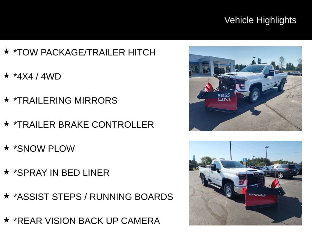 *TOW PACKAGE/TRAILER HITCH, *4X4 / 4WD, *TRAILERING MIRRORS, *TRAILER BRAKE CONTROLLER, *SNOW PLOW, *SPRAY IN BED LINER, *ASSIST STEPS / RUNNING BOARDS, *REAR VISION BACK UP CAMERA, 6-Speed Automatic, 4WD, Black Cloth, 120-Volt Bed Mounted Power Outlet, 120-Volt Instrument Panel Power Outlet, 170 Amp Alternator, 2 Speakers, 2-Speaker Audio System Feature, 2-Speed Electronic Shift Transfer Case, 3.5 Diagonal Monochromatic Display DIC, 3.73 Rear Axle Ratio, 4-Wheel Disc Brakes, 720 Cold-Cranking Amps Heavy-Duty Battery, ABS brakes, Air Conditioning, AM/FM radio, Apple CarPlay/Android Auto, Black Chevytec Spray-On Bedliner w/Chevrolet Logo, Black Front Bumper, Black Front Grille, Black Mirror Caps, Black Rear Bumper, Bluetooth® For Phone, Brake assist, Chrome Front Bumper, Chrome Rear Bumper, Deep-Tinted Glass, Delay-off headlights, Driver door bin, Dual front impact airbags, Dual front side impact airbags, Electric Rear-Window Defogger, Electronic Cruise Control w/Set & Resume Speed, Electronic Stability Control, Exterior Parking Camera Rear, EZ Lift Power Lock & Release Tailgate, Front 40/20/40 Split-Bench Seats, Front anti-roll bar, Front Center Armrest w/Storage, Front reading lights, Front wheel independent suspension, Fully automatic headlights, Heated Vertical Trailering Mirrors, High-Visibility Vertical Trailering Mirrors, Integrated Trailer Brake Controller, Locking Tailgate, Low tire pressure warning, Manual Door Locks, Manual Tailgate Function w/No EZ Lift, Manual Tilt-Wheel Steering Column, Manual Windows, Occupant sensing airbag, Outside temperature display, Overhead airbag, Overhead console, Passenger door bin, Passenger vanity mirror, Power Door Locks, Power Front Windows w/Driver Express Up/Down, Power Front Windows w/Passenger Express Down, Power steering, Preferred Equipment Group 1WT, Premium audio system: Chevrolet Infotainment 3, Radio: Chevrolet Infotainment 3 System, Rear step bumper, Remote Keyless Entry, Rubberized-Vinyl Floor Covering, Solar Absorbing Tinted Glass, Standard Tailgate, Suspension Package, Tachometer, Tilt steering wheel, Traction control, Trip computer, Variably intermittent wipers, Vinyl Seat Trim, Voltmeter, Wheels: 17 Silver Painted Steel, WT Convenience Package, 6-Speed Automatic, 4WD, Black Cloth.