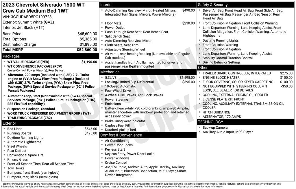 Discover the power and capability of the 2023 Chevrolet Silverado 1500 WT. This rugged and versatile truck is the perfect companion for your work and weekend adventures. With its impressive 5.3L V8 EcoTec3 engine, 4WD capabilities, and a host of advanced features, the Silverado 1500 WT is ready to take on any challenge you throw its way.Tailored to meet your needs, this Silverado 1500 WT comes equipped with an impressive array of custom features, including:- Tow Package/Trailer Hitch- 4x4 / 4WD- Trailer Brake Controller- Spray-In Bed Liner- Assist Steps/Running Boards- Rear Vision Back-Up CameraThe Chevrolet Silverado 1500 WT also boasts a comprehensive suite of advanced technologies and convenience features, such as:- WT Convenience Package- Trailering Package- Auto-Locking Rear Differential- Integrated Trailer Brake Controller- All-Weather Floor Liners- Engine Block Heater- Power Adjustable Trailering Mirrors- Bluetooth® for Phone- Power Windows with Express Up/Down- Remote Keyless Entry- Cruise Control- Rear 60/40 Folding Bench SeatDesigned with your productivity and comfort in mind, the Silverado 1500 WT delivers a driving experience that is both capable and refined. The spacious cabin, user-friendly controls, and advanced safety features work together to provide a confident and comfortable ride, no matter the task at hand.Whether you're hauling heavy loads, towing a trailer, or simply navigating the daily commute, the 2023 Chevrolet Silverado 1500 WT is the perfect choice. With its impressive performance, versatile capabilities, and thoughtful amenities, this truck is ready to help you conquer the road ahead.We invite you to experience the power and capability of the 2023 Chevrolet Silverado 1500 WT for yourself. Visit our showroom today and let our knowledgeable sales team demonstrate how this exceptional truck can meet your needs and exceed your expectations.