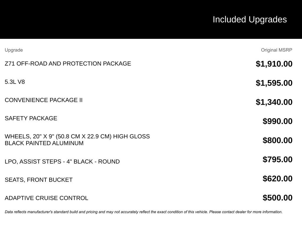 *HEATED SEATS, *TOW PACKAGE/TRAILER HITCH, *REMOTE START, *4X4 / 4WD, *Z71 OFF ROAD PACKAGE, *TRAILER BRAKE CONTROLLER, *SPRAY IN BED LINER, *HEATED STEERING WHEEL, *POWER DRIVER'S SEAT, *REAR SLIDING WINDOW, *REAR VISION BACK UP CAMERA, *REAR PARK ASSIST, *FRONT & REAR PARK ASSIST, *UNIVERSAL HOME REMOTE / GARAGE DOOR OPENER, *NAVIGATION, *BOSE PREMIUM SOUND SYSTEM, *ONSTAR, *CARFAX 1-OWNER, *CARFAX CLEAN VEHICLE HISTORY, *REMAINDER OF FACTORY WARRANTY, 10-Speed Automatic, 4WD, Black Cloth, 10-Way Power Driver Seat w/Lumbar, 12.3 Multicolor Reconfigurable Digital Display, 120-Volt Bed Mounted Power Outlet, 120-Volt Instrument Panel Power Outlet, 170 Amp Alternator, 2 USB Data Ports, 220 Amp Alternator, 3.23 Rear Axle Ratio, 4-Wheel Disc Brakes, 4 Black Round Assist Steps (LPO), 40/20/40 Front Split-Bench Seat, 6 Speakers, 6-Speaker Audio System, ABS brakes, Adaptive Cruise Control, Air Conditioning, All-Star Edition, All-Weather Floor Liner (LPO) (AAK), Alloy wheels, AM/FM radio: SiriusXM with 360L, Apple CarPlay/Android Auto, Auto High-beam Headlights, Auto-Locking Rear Differential, Automatic Emergency Braking, Automatic temperature control, Auxiliary External Transmission Oil Cooler, Bluetooth® For Phone, Brake assist, Bumpers: body-color, Chevrolet Connected Access Capable, Chevytec Spray-On Black Bedliner, Cloth Seat Trim, Color-Keyed Carpeting Floor Covering, Compass, Convenience Package, Convenience Package II, Deep-Tinted Glass, Delay-off headlights, Driver door bin, Driver vanity mirror, Dual Exhaust w/Polished Outlets, Dual front impact airbags, Dual front side impact airbags, Dual Rear USB Ports (Charge Only), Dual-Zone Automatic Climate Control, Electric Rear-Window Defogger, Electrical Steering Column Lock, Electronic Cruise Control, Electronic Stability Control, Electronic Transmission Range Selector Shifter, External Engine Oil Cooler, EZ Lift Power Lock & Release Tailgate, Floor Mounted Center Console, Following Distance Indicator, Forward Collision Alert, Front anti-roll bar, Front Bucket Seats, Front Center Armrest w/Storage, Front dual zone A/C, Front fog lights, Front Frame-Mounted Black Recovery Hooks, Front LED Fog Lamps, Front Pedestrian Braking, Front reading lights, Front Rubberized Vinyl Floor Mats, Front wheel independent suspension, Fully automatic headlights, HD Rear Vision Camera, HD Surround Vision, Heated door mirrors, Heated Driver & Front Outboard Passenger Seats, Heated front seats, Heated Power-Adjustable Outside Mirrors, Heated Steering Wheel, Heated steering wheel, Heavy-Duty Air Filter, High Capacity Suspension Package, High Gloss Black Mirror Caps, Hill Descent Control, Hitch Guidance, Hitch Guidance w/Hitch View, Illuminated entry, Inside Rear-View Mirror w/Tilt, Integrated Trailer Brake Controller, IntelliBeam Automatic High Beam On/Off, Keyless Open & Start, Lane Keep Assist w/Lane Departure Warning, LED Cargo Area Lighting, Low tire pressure warning, Not Equipped w/Steering Column Lock, Occupant sensing airbag, Off-Road Suspension, OnStar & Chevrolet Connected Services Capable, Outside temperature display, Overhead airbag, Overhead console, Panic alarm, Passenger door bin, Passenger vanity mirror, Perimeter Lighting, Power door mirrors, Power driver seat, Power Front Windows w/Driver Express Up/Down, Power Front Windows w/Passenger Express Down, Power Rear Windows w/Express Down, Power Sliding Rear Window w/Rear Defogger, Power steering, Power windows, Preferred Equipment Group 1SP, Premium audio system: Chevrolet Infotainment 3 Premium, Premium Bose 7-Speaker Sound System, Protection Package, Radio data system, Radio: Chevrolet Infotainment 3 Premium System, Rear 60/40 Folding Bench Seat (Folds Up), Rear Cross Traffic Alert-Braking, Rear Park Assist, Rear Pedestrian Alert, Rear reading lights, Rear Rubberized-Vinyl Floor Mats, Rear step bumper, Rear Wheelhouse Liners, Rear window defroster,