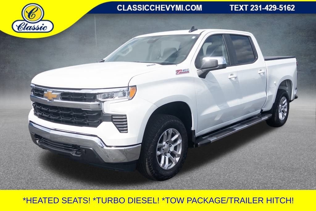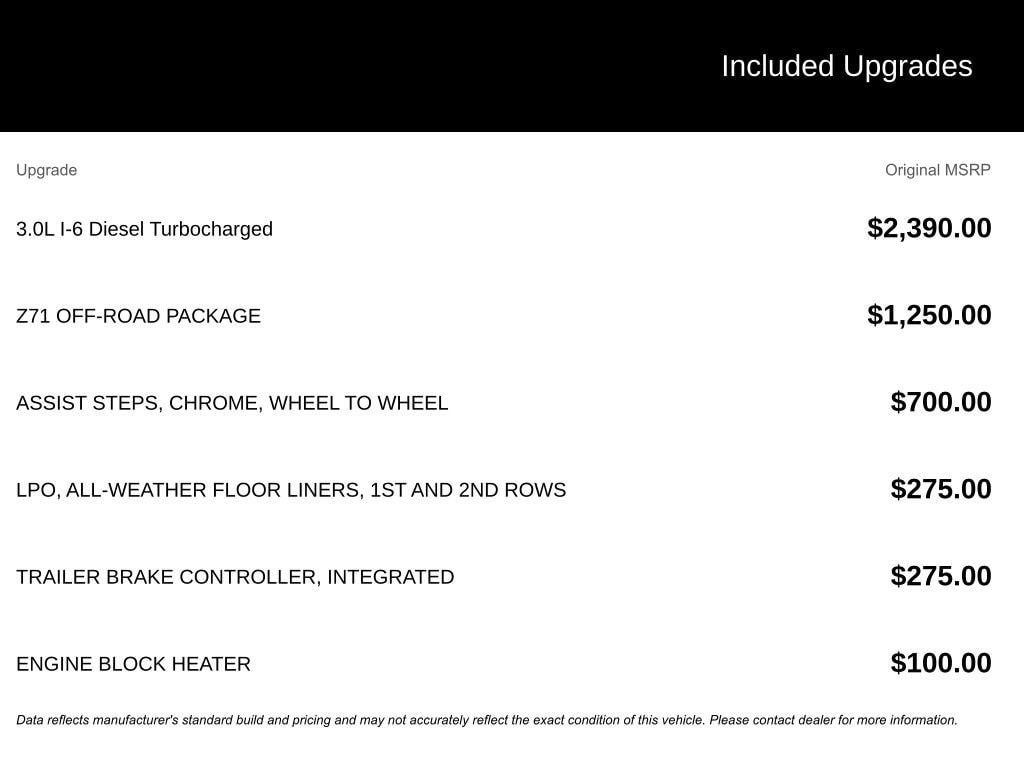 *HEATED SEATS, *TURBO DIESEL, *TOW PACKAGE/TRAILER HITCH, *REMOTE START, *4X4 / 4WD, *Z71 OFF ROAD PACKAGE, *TRAILER BRAKE CONTROLLER, *SPRAY IN BED LINER, *HEATED STEERING WHEEL, *POWER DRIVER'S SEAT, *ASSIST STEPS / RUNNING BOARDS, *TONNEAU COVER, *REAR VISION BACK UP CAMERA, *ONSTAR, *ALLOY WHEELS, *REMAINDER OF FACTORY WARRANTY, 10-Speed Automatic, 4WD, Black Cloth, 10-Way Power Driver Seat w/Lumbar, 12.3 Multicolor Reconfigurable Digital Display, 120-Volt Instrument Panel Power Outlet, All-Star Edition, Auto-Locking Rear Differential, Bluetooth® For Phone, Chrome Mirror Caps, Color-Keyed Carpeting Floor Covering, Compass, Convenience Package, Deep-Tinted Glass, Dual Exhaust w/Polished Outlets, Dual Rear USB Ports (Charge Only), Dual-Zone Automatic Climate Control, Electrical Steering Column Lock, Electronic Cruise Control, EZ Lift Power Lock & Release Tailgate, Front Frame-Mounted Black Recovery Hooks, Front Rubberized Vinyl Floor Mats, HD Rear Vision Camera, Heated Driver & Front Outboard Passenger Seats, Heated Power-Adjustable Outside Mirrors, Heated Steering Wheel, Heavy-Duty Air Filter, Hill Descent Control, Inside Rear-View Mirror w/Tilt, Keyless Open & Start, LED Cargo Area Lighting, Off-Road Suspension, OnStar & Chevrolet Connected Services Capable, Power Front Windows w/Driver Express Up/Down, Power Front Windows w/Passenger Express Down, Power Rear Windows w/Express Down, Preferred Equipment Group 1LT, Rear 60/40 Folding Bench Seat (Folds Up), Rear Rubberized-Vinyl Floor Mats, Remote Start Package, SiriusXM w/360L, Standard Tailgate, Steering Wheel Audio Controls, Trailering Package, Wheels: 18 x 8.5 Bright Silver Painted Aluminum, Wireless Phone Projection, Wrapped Steering Wheel, Z71 Off-Road Package, 120-Volt Bed Mounted Power Outlet, 220 Amp Alternator, 3.23 Rear Axle Ratio, 4-Wheel Disc Brakes, 40/20/40 Front Split-Bench Seat, 6 Speakers, 6-Speaker Audio System, ABS brakes, Air Conditioning, All-Weather Floor Liner (LPO) (AAK), Alloy wheels, AM/FM radio: SiriusXM with 360L, Apple CarPlay/Android Auto, Auto High-beam Headlights, Automatic Emergency Braking, Automatic temperature control, Brake assist, Bumpers: chrome, Chevrolet Connected Access Capable, Chrome Assist Steps, Cloth Seat Trim, Delay-off headlights, Driver door bin, Driver vanity mirror, Dual front impact airbags, Dual front side impact airbags, Electric Rear-Window Defogger, Electronic Stability Control, Engine Block Heater, Following Distance Indicator, Forward Collision Alert, Front anti-roll bar, Front Center Armrest w/Storage, Front dual zone A/C, Front Pedestrian Braking, Front reading lights, Front wheel independent suspension, Fully automatic headlights, Heated door mirrors, Heated front seats, Heated steering wheel, Hitch Guidance, Illuminated entry, Integrated Trailer Brake Controller, IntelliBeam Automatic High Beam On/Off, Lane Keep Assist w/Lane Departure Warning, Low tire pressure warning, Not Equipped w/Steering Column Lock, Occupant sensing airbag, Outside temperature display, Overhead airbag, Overhead console, Panic alarm, Passenger door bin, Passenger vanity mirror, Power door mirrors, Power driver seat, Power steering, Power windows, Premium audio system: Chevrolet Infotainment 3 Premium, Radio data system, Radio: Chevrolet Infotainment 3 Premium System, Rear reading lights, Rear step bumper, Rear window defroster, Remote keyless entry, Remote Vehicle Starter System, Security system, Speed control, Speed-sensing steering, Split folding rear seat, Standard Suspension Package, Steering wheel mounted audio controls, Tachometer, Telescoping steering wheel, Theft Deterrent System (Unauthorized Entry), Tilt steering wheel, Traction control, Trip computer, Variably intermittent wipers, Voltmeter, Wheels: 17 x 8 Bright Silver Painted Aluminum, Wi-Fi Hot Spot Capable, 10-Speed Automatic, 4WD, Black Cloth, 10-Way Power Driver Seat w/Lumbar, 12.3