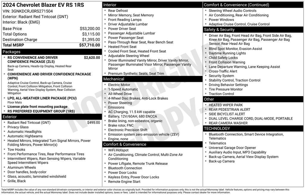 11.1 Axle Ratio, 2-Way Power Driver Lumbar Seat Adjuster, 2-Way Power Passenger Lumbar Seat Adjuster, 4-Wheel Disc Brakes, 6 Speakers, 6-Speaker Audio System Feature, 6-Way Power Passenger Seat Adjuster, 8-Way Power Driver Seat Adjuster, ABS brakes, Adaptive Cruise Control, Air Conditioning, All-Weather Cargo Area Liner (LPO), All-Weather Liner Package (LPO), Alloy wheels, AM/FM radio: SiriusXM with 360L, Auto High-beam Headlights, Auto-dimming door mirrors, Auto-dimming Rear-View mirror, Automatic temperature control, Brake assist, Bumpers: body-color, Compass, Convenience & Driver Confidence Package, Delay-off headlights, Driver door bin, Driver vanity mirror, Dual front impact airbags, Dual front side impact airbags, Electronic Stability Control, Emergency communication system: OnStar and Chevrolet connected services capable, Enhanced Automatic Emergency Braking, Four wheel independent suspension, Front & Rear All-Weather Floor Liners (LPO), Front anti-roll bar, Front Bucket Seats, Front Center Armrest, Front dual zone A/C, Front reading lights, Fully automatic headlights, Garage door transmitter, HD Surround Vision, Head-Up Display, Heated door mirrors, Heated Driver & Fr Passenger Seats Cushion & Seatback, Heated front seats, Heated Rear Outboard Passenger Cushion, Heated steering wheel, Heated Wiper Park, Illuminated entry, Intersection Automatic Emergency Braking, Knee airbag, Low tire pressure warning, Memory seat, Navigation System, Occupant sensing airbag, Outside temperature display, Overhead airbag, Overhead console, Panic alarm, Passenger door bin, Passenger vanity mirror, Perforated Suede/Evotex Seat Trim, Power door mirrors, Power driver seat, Power Liftgate, Power passenger seat, Power steering, Power windows, Preferred Equipment Group 1RS, Radio: 17.7 Diagonal Advanced Color LCD Display, Rain sensing wipers, Rear anti-roll bar, Rear Camera Washer, Rear Pedestrian Alert, Rear reading lights, Rear seat center armrest, Rear window defroster, Rear window wiper, Remote keyless entry, Reverse Automatic Braking, Ride & Handling Suspension, RS Convenience & Driver Confidence Package, Security system, Side Bicyclist Alert, SiriusXM w/360L, Speed control, Split folding rear seat, Spoiler, Sport steering wheel, Steering wheel mounted audio controls, Telescoping steering wheel, Tilt steering wheel, Traction control, Trip computer, Turn signal indicator mirrors, Variably intermittent wipers, Ventilated front seats, Wheels: 21 Machined-Face Aluminum.