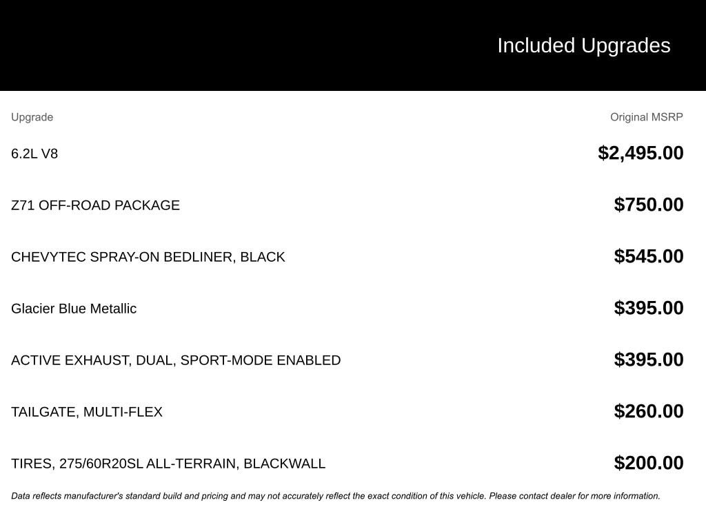 *HEATED SEATS, *TOW PACKAGE/TRAILER HITCH, *REMOTE START, *4X4 / 4WD, *Z71 OFF ROAD PACKAGE, *LOCAL TRADE, *TRAILER BRAKE CONTROLLER, *SPRAY IN BED LINER, *HEATED STEERING WHEEL, *POWER DRIVER'S SEAT, *POWER PASSENGER'S SEAT, *MEMORY DRIVER'S SEAT, *LEATHER SEATS, *VENTILATED / COOLED SEATS, *ASSIST STEPS / RUNNING BOARDS, *TONNEAU COVER, *HD REAR VISION BACK UP CAMERA, *FRONT & REAR PARK ASSIST, *BLIND SPOT MONITOR, *SIDE BLIND ZONE ALERT, *REAR CROSS TRAFFIC ALERT, *LANE DEPARTURE WARNING, *LANE KEEP ASSIST, *FORWARD COLLISION ALERT, *AUTOMATIC BRAKING, *INTELLIBEAM HEADLIGHTS, *FOG LIGHTS, *BOSE PREMIUM SOUND SYSTEM, *ONSTAR, *CHROME WHEELS, *20 INCH WHEELS, *CARFAX 1-OWNER, *CARFAX CLEAN VEHICLE HISTORY, *REMAINDER OF FACTORY WARRANTY, 10-Speed Automatic, 4WD, Jet Black Leather, 10-Way Power Driver Seat w/Lumbar, 10-Way Power Passenger Seat Adjuster w/Lumbar, 12.3 Multicolor Reconfigurable Digital Display, 120-Volt Bed Mounted Power Outlet, 120-Volt Interior Power Outlet, 170 Amp Alternator, 2 USB Data Ports, 3.23 Rear Axle Ratio, 4-Wheel Disc Brakes, 7 Speakers, ABS brakes, Air Conditioning, Alloy wheels, AM/FM radio: SiriusXM with 360L, Auto High-beam Headlights, Auto-dimming door mirrors, Auto-Dimming Inside Rear-View Mirror, Auto-dimming Rear-View mirror, Auto-Locking Rear Differential, Automatic Emergency Braking, Automatic temperature control, Bluetooth® For Phone, Brake assist, Bumpers: chrome, Chevrolet Connected Access Capable, Chevytec Spray-On Black Bedliner, Chrome Mirror Caps, Color-Keyed Carpeting Floor Covering, Compass, Deep-Tinted Glass, Delay-off headlights, Driver door bin, Driver Memory, Driver vanity mirror, Dual Active Exhaust, Dual Exhaust w/Polished Outlets, Dual front impact airbags, Dual front side impact airbags, Dual Rear USB Ports (Charge Only), Electric Rear-Window Defogger, Electrical Steering Column Lock, Electronic Cruise Control, Electronic Stability Control, Electronic Transmission Range Selector Shifter, EZ Lift Power Lock & Release Tailgate, Floor Mounted Center Console, Following Distance Indicator, Forward Collision Alert, Front anti-roll bar, Front Bucket Seats, Front Center Armrest, Front dual zone A/C, Front fog lights, Front Frame-Mounted Black Recovery Hooks, Front LED Fog Lamps, Front Pedestrian Braking, Front Rain-Sensing Wipers, Front reading lights, Front Rubberized Vinyl Floor Mats, Front wheel independent suspension, Fully automatic headlights, HD Surround Vision, Heated door mirrors, Heated Driver & Front Outboard Passenger Seats, Heated front seats, Heated Steering Wheel, Heated steering wheel, Heavy-Duty Air Filter, High Capacity Suspension Package, Hill Descent Control, Hitch Guidance, Hitch Guidance w/Hitch View, Illuminated entry, In-Vehicle Trailering System App, Integrated Trailer Brake Controller, IntelliBeam Automatic High Beam On/Off, Keyless Open & Start, Lane Keep Assist w/Lane Departure Warning, LED Cargo Area Lighting, Low tire pressure warning, LTZ Convenience Package, LTZ Plus Package, Memory seat, Multi-Flex Tailgate, Occupant sensing airbag, Off-Road Suspension, OnStar & Chevrolet Connected Services Capable, Outside Heated Power-Adjustable Mirrors, Outside temperature display, Overhead airbag, Overhead console, Panic alarm, Passenger door bin, Passenger vanity mirror, Perforated Leather-Appointed Front Seat Trim, Perimeter Lighting, Power door mirrors, Power driver seat, Power Front Passenger Windows w/Express Up/Down, Power Front Windows w/Driver Express Up/Down, Power passenger seat, Power Rear Windows w/Express Down, Power steering, Power Tailgate, Power Tilt & Telescoping Steering Column, Power windows, Preferred Equipment Group 1LZ, Premium audio system: Chevrolet Infotainment 3 Premium, Premium Bose 7-Speaker Sound System, Radio data system, Radio: Chevrolet Infotainment 3 Premium System, Rain sensing wipers, Rear Cross Traffic Braking, Rear Pedestrian Alert,