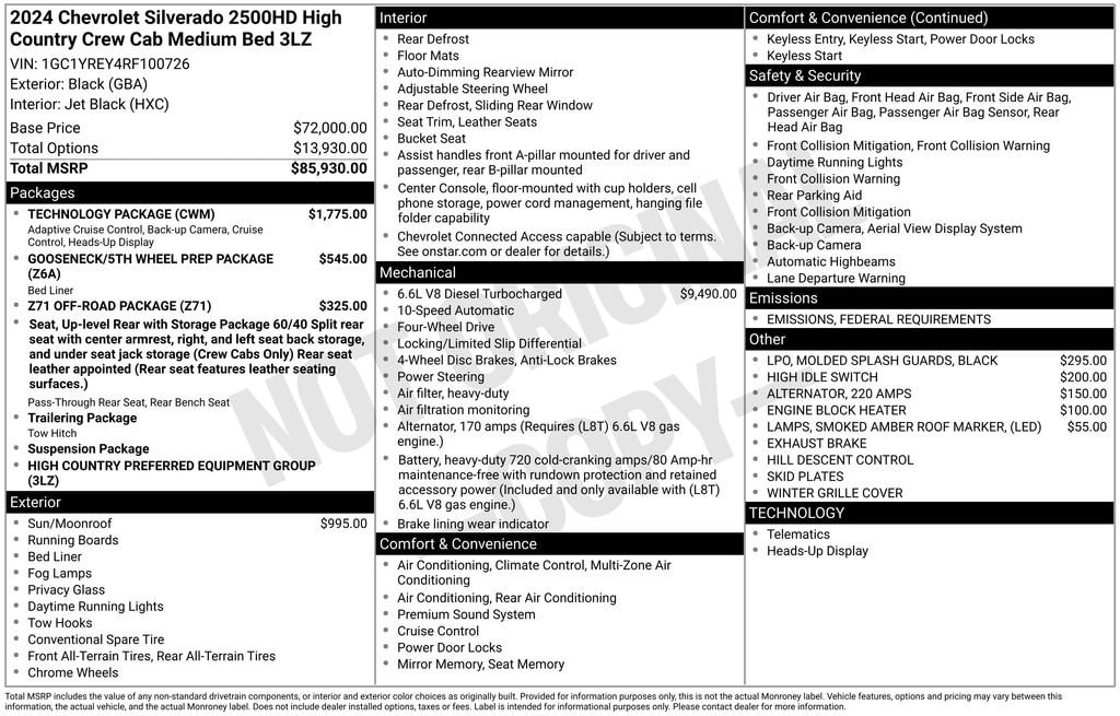 10-Speed Automatic, 4WD, Black Leather, 10-Way Power Driver Seat Adjuster w/Lumbar, 10-Way Power Passenger Seat Adjuster w/Lumbar, 120-Volt Bed Mounted Power Outlet, 120-Volt Interior Power Outlet, 15 Diagonal Multicolor Head-Up Display, 170 Amp Alternator, 220 Amp Alternator, 4-Wheel Disc Brakes, 6 Rectangular Chromed Tubular Assist Steps, 7 Speakers, 720 Cold-Cranking Amps Heavy-Duty Battery, ABS brakes, Adaptive Cruise Control, Air Conditioning, Alloy wheels, AM/FM radio: SiriusXM with 360L, Apple CarPlay/Android Auto, Auto High-beam Headlights, Auto-dimming door mirrors, Auto-Dimming Inside Rear-View Mirror, Auto-dimming Rear-View mirror, Automatic temperature control, Bed View Camera w/2 Trailer Camera Provisions, Black Chevytec Spray-On Bedliner, Black Molded Splash Guards (LPO), Bluetooth® For Phone, Body-Color Front Bumper, Body-Color Rear Bumper, Bodyside moldings, BOSE Premium 7-Speaker Sound System, Brake assist, Bumpers: body-color, Chevrolet Connected Access Capable, Chrome Door Handles, Chrome Mirror Caps, Color-Keyed Carpeting Floor Covering, Compass, Deep-Tinted Glass, Delay-off headlights, Driver door bin, Driver Memory, Driver vanity mirror, Dual front impact airbags, Dual front side impact airbags, Durabed Pickup Bed, Electric Rear-Window Defogger, Electronic Cruise Control w/Set & Resume Speed, Electronic Stability Control, Engine Block Heater, Exhaust Brake, Floor-Mounted Center Console, Front anti-roll bar, Front Bucket Seats, Front Carpeted Floor Mats, Front Center Armrest, Front Chrome Recovery Hooks, Front dual zone A/C, Front fog lights, Front LED Fog Lamps, Front Rain-Sensing Wipers, Front reading lights, Front wheel independent suspension, Fully automatic headlights, Garage door transmitter, Genuine wood console insert, Genuine wood dashboard insert, Genuine wood door panel insert, Gooseneck/5th Wheel Prep Package, Heated 2nd Row Outboard Seats, Heated door mirrors, Heated Driver & Front Outboard Passenger Seating, Heated front seats, Heated rear seats, Heated Steering Wheel, Heated steering wheel, High Idle Switch, Hill Descent Control, Hitch Guidance w/Hitch View, Illuminated entry, In-Vehicle Trailering App System, Keyless Open & Start, LED Cargo Area Lighting, LED Smoked Amber Roof Marker Lamps, Low tire pressure warning, Manual Tilt & Telescoping Steering Column, Memory seat, Occupant sensing airbag, Off-Road Suspension, OnStar & Chevrolet Connected Services Capable, Outside temperature display, Overhead airbag, Overhead console, Panic alarm, Passenger door bin, Passenger vanity mirror, Perforated Leather Seat Trim, Polished Exhaust Tip, Power Door Locks, Power door mirrors, Power driver seat, Power Front Windows w/Driver Express Up/Down, Power Front Windows w/Passenger Express Up/Down, Power passenger seat, Power Rear Windows w/Express Down, Power Sliding Rear Window w/Defogger, Power steering, Power Sunroof, Power windows, Preferred Equipment Group 3LZ, Premium audio system: Chevrolet Infotainment 3 Premium, Push Button Start, Pwr Up/Down Tailgate Function w/Pwr Lock & Release, Radio: Chevrolet Infotainment 3 Premium System, Rain sensing wipers, Rear Camera Mirror, Rear Carpeted Floor Mats, Rear Cross Traffic Alert, Rear reading lights, Rear seat center armrest, Rear step bumper, Rear Wheelhouse Liners, Rear window defroster, Remote keyless entry, Remote Vehicle Starter System, Security system, SiriusXM w/360L, Speed control, Speed-sensing steering, Split folding rear seat, Standard Tailgate, Steering Wheel Audio Controls, Steering wheel mounted audio controls, Suspension Package, Tachometer, Technology Package, Telescoping steering wheel, Tilt steering wheel, Traction control, Trailer Camera Provisions, Trip computer, Turn signal indicator mirrors, Ultrasonic Front & Rear Park Assist, Unauthorized Entry Theft-Deterrent System, Universal Home Remote, Up-Level Rear Seat w/Storage Package, Variably intermittent wipers, Venti