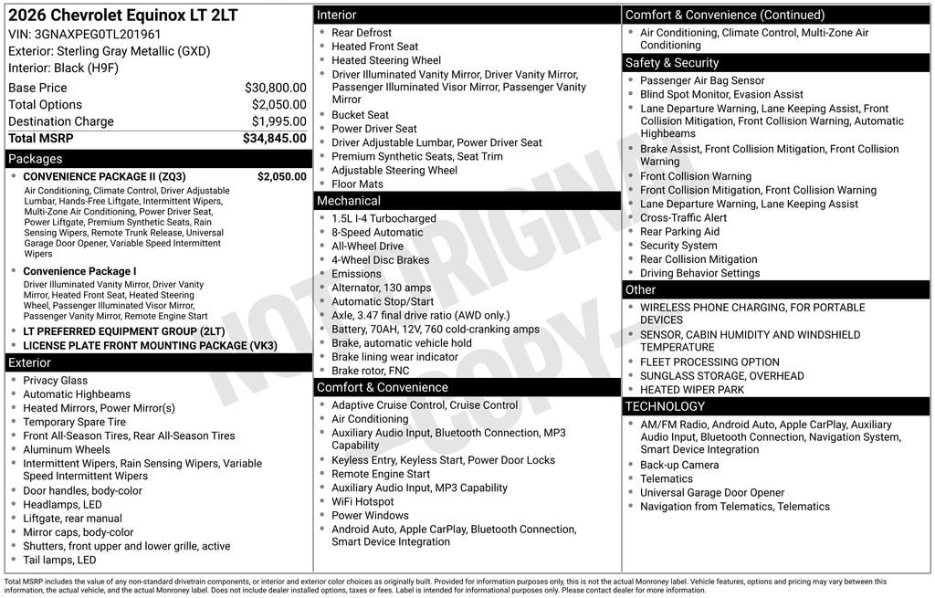 AWD, 2-Way Power Driver Lumbar Control Seat Adjuster, 3.47 Final Drive Axle Ratio, 4-Wheel Disc Brakes, 6 Speakers, ABS brakes, Air Conditioning, Alloy wheels, AM/FM radio: SiriusXM, Auto High-beam Headlights, Autosense Hands-Free Programmable Power Liftgate, Brake assist, Bumpers: body-color, Cabin Humidity and Windshield Sensor, Cloth Seat Trim, Compass, Convenience Package II, Delay-off headlights, Driver 6-Way Manual Seat Adjuster, Driver 8-Way Power Seat Adjuster, Driver door bin, Driver vanity mirror, Dual front impact airbags, Dual front side impact airbags, Dual-Zone Automatic Climate Control, Electronic Stability Control, Emergency communication system: OnStar and Chevrolet connected services capable, Evotex Seat Trim, Four wheel independent suspension, Front anti-roll bar, Front Bucket Seats, Front Center Armrest, Front Passenger 4-Way Manual Seat Adjuster, Front reading lights, Fully automatic headlights, Heated door mirrors, Heated Driver and Front Passenger Seats, Heated front seats, Heated steering wheel, Heated Wiper Park, Illuminated entry, Intermittent Front Rain-Sensing Wipers, Low tire pressure warning, Navigation System, Occupant sensing airbag, Outside temperature display, Overhead airbag, Overhead console, Overhead Sunglass Storage, Panic alarm, Passenger door bin, Passenger vanity mirror, Power door mirrors, Power steering, Power windows, Preferred Equipment Group 2LT, Premium audio system: Chevrolet Infotainment 3, Programmable Universal Home Remote, Radio data system, Radio: 11.3 Diagonal Advanced Color LCD Display, Rear anti-roll bar, Rear reading lights, Rear seat center armrest, Rear window defroster, Rear window wiper, Remote keyless entry, Security system, SiriusXM with 360L Trial Subscription, Speed control, Speed-sensing steering, Split folding rear seat, Spoiler, Steering wheel mounted audio controls, Tachometer, Telescoping steering wheel, Tilt steering wheel, Traction control, Trip computer, Variably intermittent wipers, Wheels: 17 Grazen Metallic Machined-Face Aluminum, Wireless Phone Charging For Portable Devices, AWD.