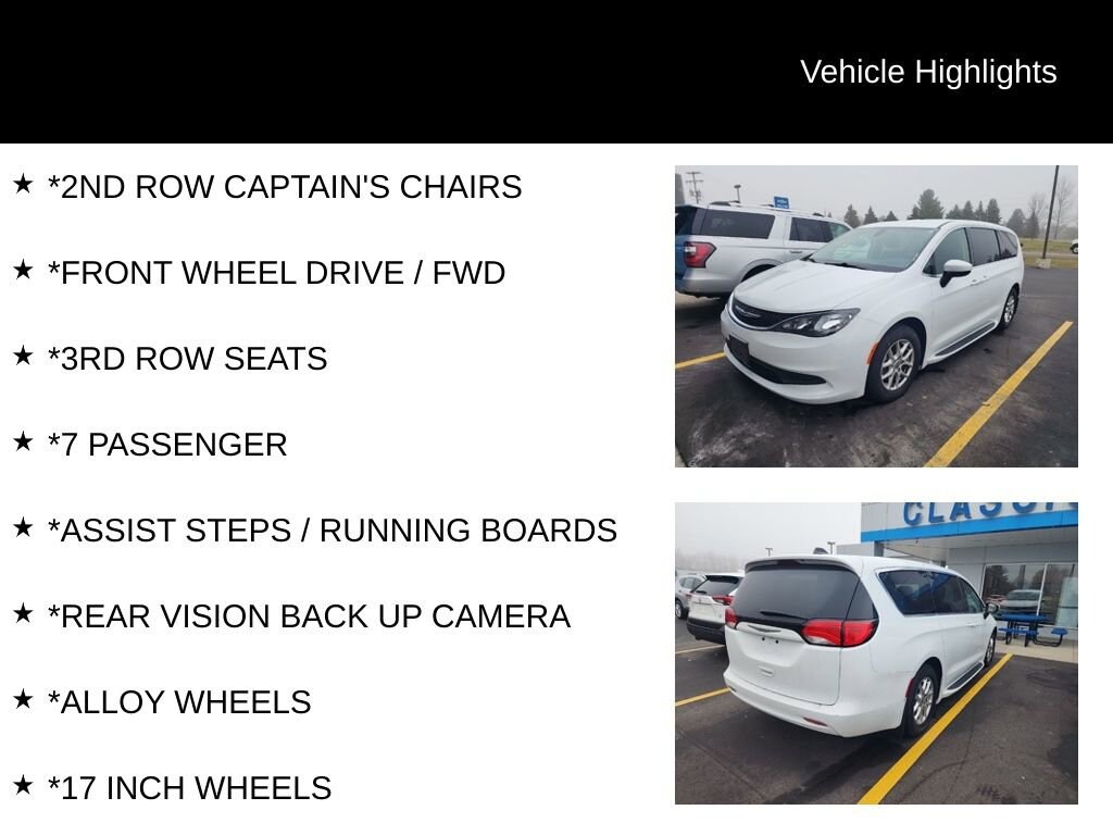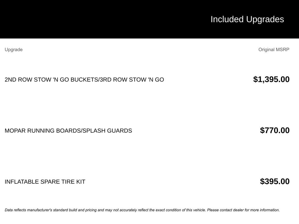 *2ND ROW CAPTAIN'S CHAIRS, *FRONT WHEEL DRIVE / FWD, *3RD ROW SEATS, *7 PASSENGER, *ASSIST STEPS / RUNNING BOARDS, *REAR VISION BACK UP CAMERA, *ALLOY WHEELS, *17 INCH WHEELS, 17 x 7 Aluminum Wheels, 3.25 Axle Ratio, 3rd row seats: split-bench, 4-Wheel Disc Brakes, 6 Speakers, ABS brakes, Air Conditioning, Alloy wheels, AM/FM radio: SiriusXM, Apple CarPlay/Android Auto, Automatic temperature control, Black Seats, Brake assist, Bumpers: body-color, Cloth Bucket Seats, Compass, Delay-off headlights, Driver door bin, Driver vanity mirror, Driver's Seat Mounted Armrest, Dual front impact airbags, Dual front side impact airbags, Electronic Stability Control, Four wheel independent suspension, Front anti-roll bar, Front Bucket Seats, Front dual zone A/C, Front reading lights, Fully automatic headlights, Heated door mirrors, Illuminated entry, Instrument Panel Anodized Silver Bezel, Knee airbag, Low tire pressure warning, Mineral Shitake Accents, MOPAR Running Boards/Splash Guards, Occupant sensing airbag, Outside temperature display, Overhead airbag, Overhead console, Panic alarm, ParkView Rear Back-Up Camera, Passenger door bin, Passenger seat mounted armrest, Passenger vanity mirror, Power door mirrors, Power driver seat, Power steering, Power windows, Quick Order Package 27E, Radio data system, Radio: Uconnect 4 w/7 Display, Rear air conditioning, Rear Splash Guards, Rear window defroster, Rear window wiper, Reclining 3rd row seat, Remote keyless entry, Speed control, Split folding rear seat, Spoiler, Steering wheel mounted audio controls, Tachometer, Telescoping steering wheel, Tilt steering wheel, Touring Suspension, Traction control, Trip computer, Variably intermittent wipers, Voltmeter.