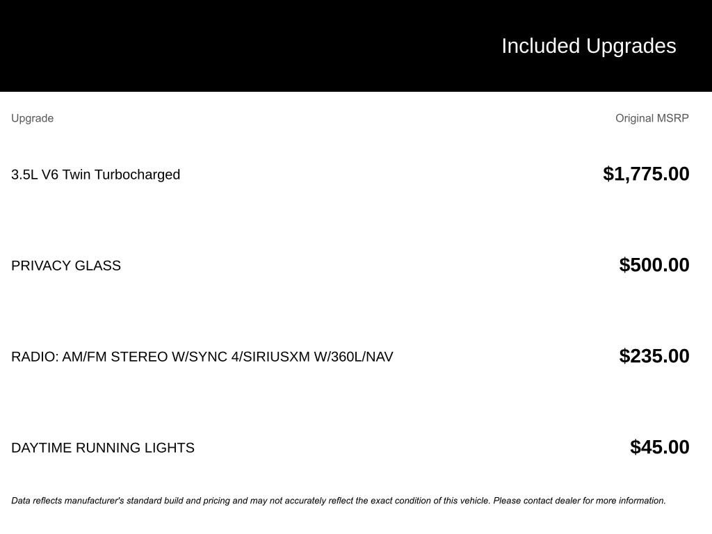 Under the hood, the powerful EcoBoost 3.5L V6 engine delivers exceptional performance, while the 10-Speed Automatic Transmission with Overdrive ensures smooth, efficient power delivery. Enjoy the convenience of SYNC 4 with Navigation, SiriusXM, and a 12-inch multi-function display, as well as the added security of privacy glass and daytime running lights.