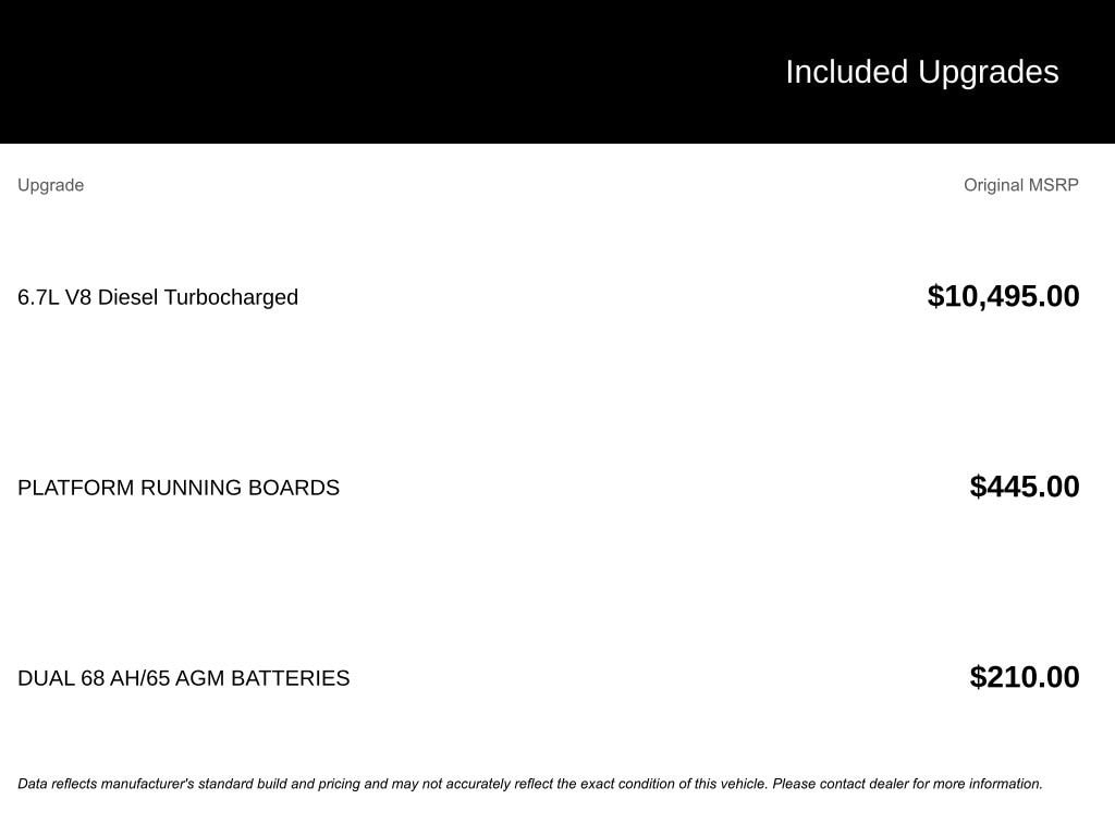 *TURBO DIESEL, *TOW PACKAGE/TRAILER HITCH, *TRAILERING MIRRORS, *TRAILER BRAKE CONTROLLER, *REAR VISION BACK UP CAMERA, 4WD, 3.31 Axle Ratio, 3.73 Axle Ratio, 4-Wheel Disc Brakes, 6 Speakers, ABS brakes, Air Conditioning, Alloy wheels, AM/FM radio, AM/FM Stereo w/MP3 Player, Auto High-beam Headlights, Brake assist, Bumpers: chrome, Cloth 40/20/40 Split Bench Seat, Compass, Delay-off headlights, Driver door bin, Driver vanity mirror, Dual 68 AH/65 AGM Batteries, Dual front impact airbags, Dual front side impact airbags, Electronic Stability Control, Emergency communication system: SYNC 4 911 Assist, Exterior Parking Camera Rear, Front anti-roll bar, Front Center Armrest w/Storage, Front fog lights, Front reading lights, Fully automatic headlights, GVWR: 10,000 lb Payload Package, Heated door mirrors, Illuminated entry, Low tire pressure warning, Order Code 603A, Outside temperature display, Overhead airbag, Overhead console, Panic alarm, Passenger door bin, Passenger vanity mirror, Platform Running Boards, Power door mirrors, Power driver seat, Power steering, Power windows, Privacy Glass, Rear reading lights, Rear step bumper, Remote keyless entry, Speed control, Split folding rear seat, Steering wheel mounted audio controls, SYNC 4, Tachometer, Telescoping steering wheel, Tilt steering wheel, Traction control, Trip computer, Turn signal indicator mirrors, Variably intermittent wipers, Wheels: 18 Sparkle Silver Painted Cast Aluminum, 4WD.
