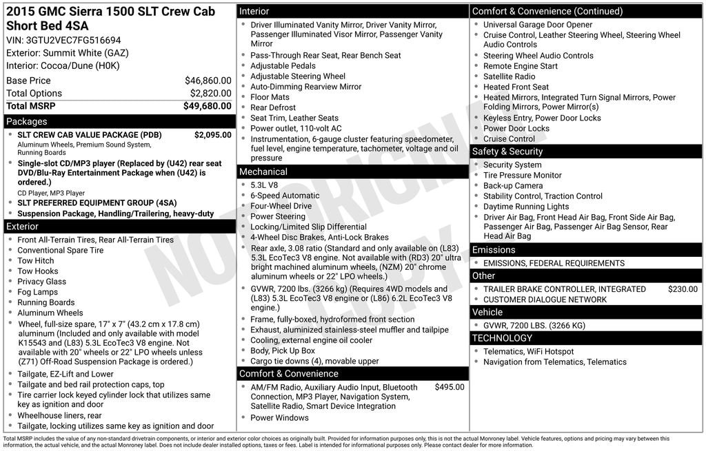 6-Speed Automatic Electronic with Overdrive, 4WD, Cocoa/Dune Leather, 10-Way Power Driver's Seat Adjuster, 110-Volt AC Power Outlet, 150 Amp Alternator, 20 x 9 Polished Aluminum Wheels, 4-Wheel Disc Brakes, 4.2 Diagonal Color Display Driver Info Center, 40/20/40 Front Split Bench Seat, 6 Speakers, 6 Rectangular Chromed Tubular Assist Steps, ABS brakes, Adjustable pedals, Air Conditioning, Alloy wheels, AM/FM radio: SiriusXM, Auto-dimming door mirrors, Auto-Dimming Inside Rear-View Mirror, Auto-dimming Rear-View mirror, Automatic temperature control, Auxiliary External Transmission Oil Cooler, Bodyside moldings, Bose Speaker System, Brake assist, Bumpers: chrome, CD player, Chrome Bodyside Moldings, Chrome Door Handles, Chrome Front Bumper, Chrome Grille Surround, Chrome Mirror Caps, Chrome Rear Bumper, Color-Keyed Carpeting w/Rubberized Vinyl Floor Mats, Compass, Deep-Tinted Glass, Delay-off headlights, Driver & Front Passenger Illuminated Vanity Mirrors, Driver door bin, Driver vanity mirror, Dual front impact airbags, Dual front side impact airbags, Dual-Zone Automatic Climate Control, Electric Rear-Window Defogger, Electronic Autotrac Transfer Case, Electronic Stability Control, Emergency communication system: OnStar Directions & Connections, Exterior Parking Camera Rear, EZ Lift & Lower Tailgate, Front anti-roll bar, Front Center Armrest w/Storage, Front dual zone A/C, Front fog lights, Front Frame-Mounted Black Recovery Hooks, Front Halogen Fog Lamps, Front reading lights, Front wheel independent suspension, Fully automatic headlights, Garage door transmitter: HomeLink, Heated door mirrors, Heated Driver & Front Passenger Seats, Heated front seats, Heavy Duty Suspension, Heavy-Duty Rear Locking Differential, Illuminated entry, Integrated Trailer Brake Controller, Leather Appointed Seat Trim, Leather Wrapped Steering Wheel w/Cruise Controls, LED Cargo Box Lighting, Low tire pressure warning, Manual Tilt Wheel Steering Column, Memory seat, Occupant sensing airbag, OnStar 6 Months Directions & Connections Plan, OnStar w/4G LTE, Outside temperature display, Overhead airbag, Overhead console, Panic alarm, Passenger door bin, Passenger vanity mirror, Power Adjustable Pedals, Power door mirrors, Power driver seat, Power Folding & Adjustable Heated Outside Mirrors, Power passenger seat, Power steering, Power windows, Power Windows w/Driver Express Up & Down, Preferred Equipment Group 4SA, Premium audio system: IntelliLink, Radio data system, Radio: AM/FM Stereo w/8 Diagonal Color Touch Nav., Radio: AM/FM Stereo w/8 Diagonal Color Touch Screen, Rear 60/40 Folding Bench Seat (Folds Up), Rear Bumper Cornersteps, Rear reading lights, Rear seat center armrest, Rear step bumper, Rear Vision Camera w/Dynamic Guide Lines, Rear Wheelhouse Liners, Rear window defroster, Remote Keyless Entry, Remote keyless entry, Remote Vehicle Starter System, Security system, Single Slot CD/MP3 Player, SiriusXM Satellite Radio, SLT Crew Cab Value Package, Speed control, Speed-sensing steering, Split folding rear seat, Steering Wheel Audio Controls, Steering wheel mounted audio controls, Tachometer, Telescoping steering wheel, Theft Deterrent System (Unauthorized Entry), Tilt steering wheel, Traction control, Trailering Equipment, Trip computer, Turn signal indicator mirrors, Universal Home Remote, Variably intermittent wipers, Voltmeter, Wheels: 18 x 8.5 Polished Aluminum, 6-Speed Automatic Electronic with Overdrive, 4WD, Cocoa/Dune Leather.
