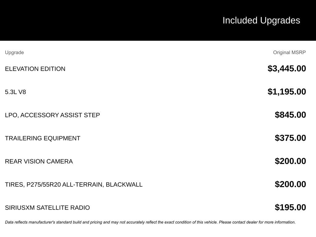 *TOW PACKAGE/TRAILER HITCH, *REMOTE START, *4X4 / 4WD, *OFF ROAD PACKAGE, *TONNEAU COVER, *REAR VISION BACK UP CAMERA, *FOG LIGHTS, *ONSTAR, *ALLOY WHEELS, *18 INCH WHEELS, *CARFAX CLEAN VEHICLE HISTORY, 6-Speed Automatic Electronic with Overdrive, 4WD, Dark Ash Seats With Jet Black Interior Accents Cloth, 110-Volt AC Power Outlet, 150 Amp Alternator, 3-Passenger Full-Width Folding Rear Bench Seat, 3.5 Diagonal Monochromatic Display DIC, Black Manual Outside Mirrors, Body Color Bodyside Moldings, Body Color Door Handles, Body Color Front Bumper, Body Color Grille Surround, Body Color Power Adjustable Heated Outside Mirrors, Body Color Rear Bumper w/Cornersteps, Body-Color Mirror Caps, Color-Keyed Carpeting w/Rubberized Vinyl Floor Mats, Deep-Tinted Glass, Elevation Edition, Front Frame-Mounted Black Recovery Hooks, Graphite-Colored Rubberized-Vinyl Floor Covering, Heavy-Duty Rear Locking Differential, LED Cargo Box Lighting, Preferred Equipment Group 1SA, Radio: AM/FM Stereo w/7 Diagonal Color Touch Screen, Remote Keyless Entry, Single-Zone Air Conditioning, Solar Absorbing Tinted Glass, Thin Profile LED Front Fog Lamps, Trailering Equipment, Wheels: 20 x 9 Black-Painted Aluminum, 3.42 Rear Axle Ratio, 4-Wheel Disc Brakes, 40/20/40 Front Split Bench Seat, 6 Speakers, 6-Speaker Audio System, ABS brakes, Accessory Assist Step (LPO), Air Conditioning, AM/FM radio, Auxiliary External Transmission Oil Cooler, Black Power Adjustable Heated Outside Mirrors, Brake assist, Bumpers: chrome, Cloth Seat Trim, Delay-off headlights, Driver door bin, Dual front impact airbags, Dual front side impact airbags, Electronic Stability Control, Front anti-roll bar, Front Center Armrest w/Storage, Front reading lights, Front wheel independent suspension, Fully automatic headlights, Heavy Duty Suspension, High-Intensity Discharge Headlights, Low tire pressure warning, Occupant sensing airbag, OnStar 6 Month Guidance Plan, OnStar w/4G LTE, Overhead airbag, Overhead console, Passenger door bin, Passenger vanity mirror, Power steering, Power windows, Radio data system, Radio: AM/FM Stereo w/4.2 Diagonal Color Display, Rear reading lights, Rear seat center armrest, Rear step bumper, Rear Vision Camera, Remote Locking Tailgate, SiriusXM Satellite Radio, Speed control, Speed-sensing steering, Tachometer, Tilt steering wheel, Traction control, Trip computer, Variably intermittent wipers, Voltmeter, Wheels: 17 x 8 Painted Steel, 6-Speed Automatic Electronic with Overdrive, 4WD, Dark Ash Seats With Jet Black Interior Accents Cloth, 110-Volt AC Power Outlet, 150 Amp Alternator, 3-Passenger Full-Width Folding Rear Bench Seat, 3.5 Diagonal Monochromatic Display DIC, Black Manual Outside Mirrors, Body Color Bodyside Moldings, Body Color Door Handles, Body Color Front Bumper, Body Color Grille Surround, Body Color Power Adjustable Heated Outside Mirrors, Body Color Rear Bumper w/Cornersteps, Body-Color Mirror Caps, Color-Keyed Carpeting w/Rubberized Vinyl Floor Mats, Deep-Tinted Glass, Elevation Edition, Front Frame-Mounted Black Recovery Hooks, Graphite-Colored Rubberized-Vinyl Floor Covering, Heavy-Duty Rear Locking Differential, LED Cargo Box Lighting, Preferred Equipment Group 1SA, Radio: AM/FM Stereo w/7 Diagonal Color Touch Screen, Remote Keyless Entry, Single-Zone Air Conditioning, Solar Absorbing Tinted Glass, Thin Profile LED Front Fog Lamps, Trailering Equipment, Wheels: 20 x 9 Black-Painted Aluminum.