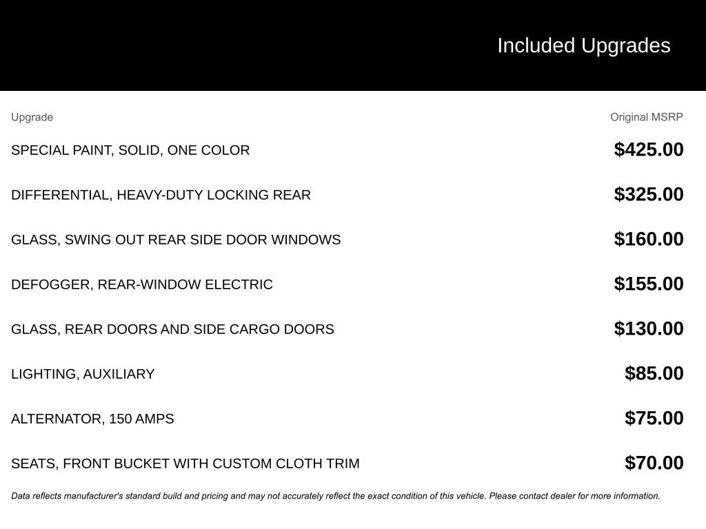 Step inside and you'll find a well-appointed interior designed with your productivity in mind. The front bucket seats with custom cloth trim provide all-day comfort, while the swing-out rear side door windows and rear-window electric defogger enhance visibility and convenience. The auxiliary lighting with reading and underhood lights ensure you have ample illumination, no matter the task at hand.