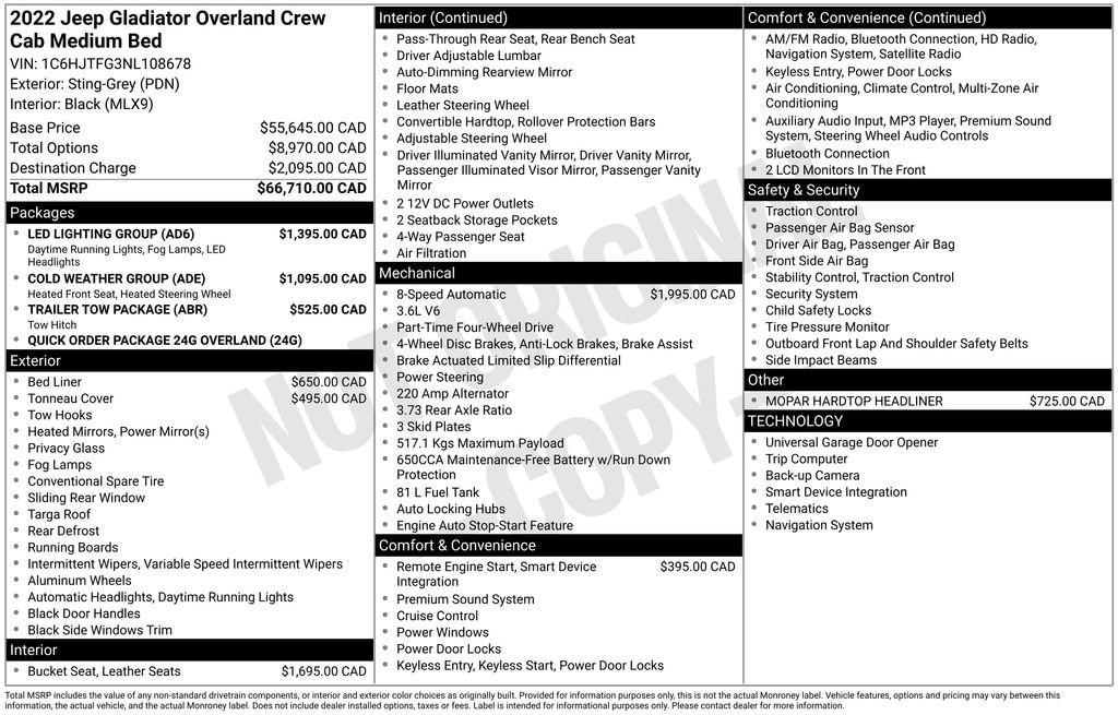 Under the hood, you'll find a powerful 3.6L V6 24V VVT engine mated to an 8-speed automatic transmission, delivering an exceptional blend of power and efficiency. With 17 city/22 highway MPG, this Gladiator Overland is ready to take you further.