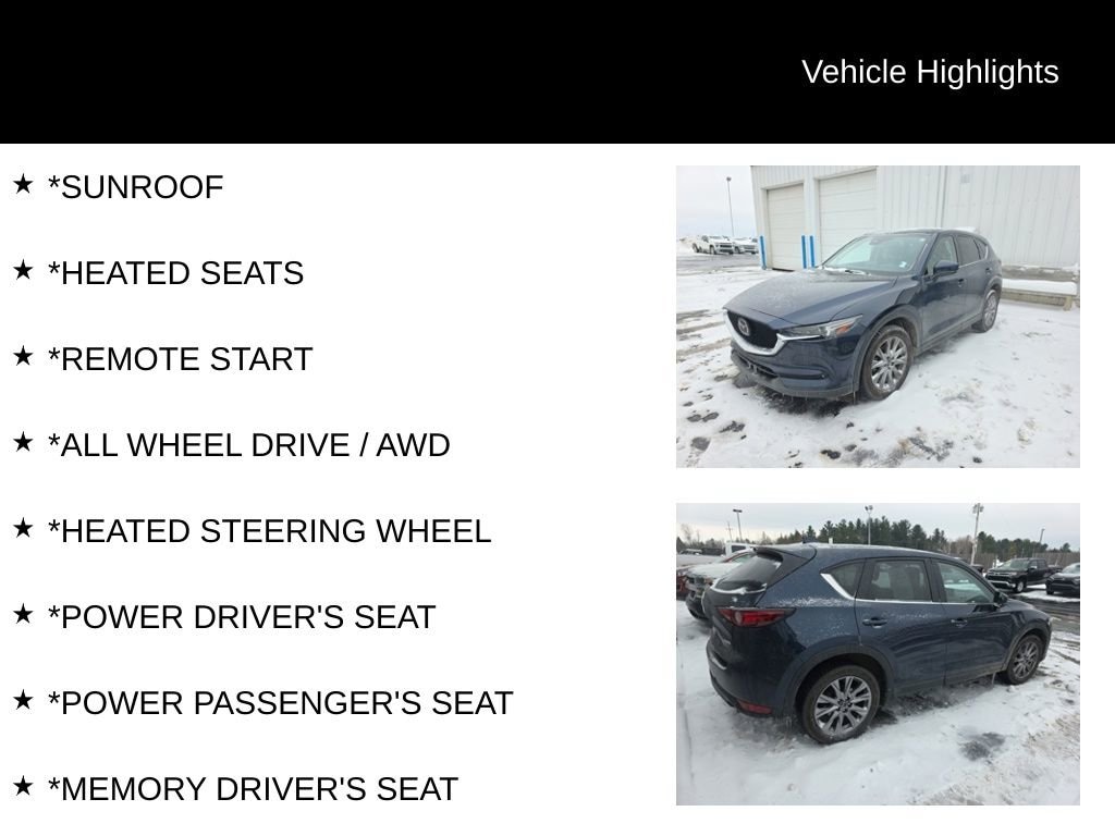 Under the hood, the 2.5L 4-cylinder engine, paired with a 6-speed automatic transmission and all-wheel drive, delivers a dynamic and responsive performance. With an impressive EPA-estimated 22 MPG in the city and 27 MPG on the highway, this CX-5 offers the perfect balance of power and efficiency.