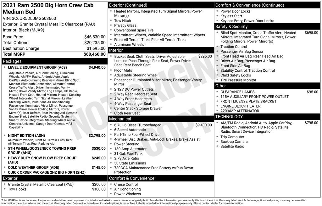Clean CARFAX.115V Auxiliary Front Power Outlet, 115V Auxiliary Rear Power Outlet, 2 Way Rear Headrest Seat, 220 Amp Alternator, 2nd Row In Floor Storage Bins, 3.73 Axle Ratio, 4 Way Front Headrests, 4-Wheel Disc Brakes, 40/20/40 Split Bench Seat, 5th Wheel/Gooseneck Towing Prep Group, 6 Speakers, 8.4 Touchscreen Display, ABS brakes, Active Noise Control System, Air Conditioning, Air Conditioning ATC w/Dual Zone Control, AM/FM radio, Apple CarPlay, Auto-Dimming Rear-View Mirror, Big Horn IP Badge, Black Exterior Truck Badging, Black Headlamp Bezels, Black Interior Accents, Black Ram Head Tailgate Badge, Black Tail Lamp Bezels, Black Wheel Center Hub, Blind Spot & Cross Path Detection (DISC), Body Color Grille Surround, Brake assist, Bumpers: chrome, Center Hub, Center Stack Storage Drawer, Clearance Lamps, Cloth 40/20/40 Bench Seat, Cluster 7.0 TFT Color Display, Cold Weather Group, Compass, Dampened Tailgate, Delay-off headlights, Driver door bin, Dual front impact airbags, Dual front side impact airbags, Dual Glove Boxes, Electronic Stability Control, Electronically Controlled Throttle, Engine Block Heater, Exterior 115V AC Outlet, Foam Bottle Insert (Door Trim Panel), Folding Flat Load Floor Storage, Footwell Courtesy Lamp, Front anti-roll bar, Front Armrest w/Cupholders, Front Center Armrest w/Storage, Front Center Seat Cushion Storage, Front Fog Lamps, Front License Plate Bracket, Front reading lights, Front Seat Back Map Pockets, Fully automatic headlights, Gloss Black Grille Billets/Accents, Glove Box Lamp, Google Android Auto, GPS Antenna Input, Heated door mirrors, Heated Front Seats, Heated Steering Wheel, Heavy Duty Snow Plow Prep Group, Illuminated entry, Integrated Center Stack Radio, Integrated Voice Command w/Bluetooth, Leather Wrapped Steering Wheel, LED Tail Lamps, Level 2 Equipment Group (DISC), Locking Lower Glove Box, Low tire pressure warning, Manual Adjust 4-Way Driver Seat, Manual Adjust 4-Way Front Passenger Seat, Media Hub w/2 Charge Only USBs, MOPAR Winter Front Grille Cover, Night Edition, Occupant sensing airbag, Outside temperature display, Overhead airbag, Overhead console, Painted Front Bumper, Painted Rear Bumper, Panic alarm, ParkSense Front/Rear Park Assist System, ParkView Rear Back-Up Camera, Passenger door bin, Passenger vanity mirror, Power 2-Way Driver Lumbar Adjust, Power Adjust 8-Way Driver Seat, Power Adjust/Fold & Heated Black Tow Mirrors, Power Adjustable Pedals, Power door mirrors, Power Folding Mirrors, Power steering, Power windows, Premium Cloth 40/20/40 Bench Seat, Quick Order Package 2HZ Big Horn, Radio data system, Radio: Uconnect 3 w/5 Display, Radio: Uconnect 4 w/8.4 Display, Rear 60/40 Folding Seat, Rear anti-roll bar, Rear Dome w/On/Off Switch Lamp, Rear Folding Seat, Rear Power Sliding Window, Rear seat center armrest, Rear step bumper, Rear Window Defroster, Remote keyless entry, Remote Start System, Security Alarm, SiriusXM Satellite Radio, Speed control, Steering Wheel Mounted Audio Controls, Sun Visors w/Illuminated Vanity Mirrors, Tachometer, Tilt steering wheel, Tip Start, Tow Hooks, Traction control, Trip computer, Turn signal indicator mirrors, Universal Garage Door Opener, Variably intermittent wipers, Vendor Painted Cargo Box Tracking, Voltmeter, Wheels: 18 x 8.0 Polished Aluminum, Wheels: 18 x 8.0 Steel Chrome Clad, Wheels: 20 x 8.0 Black Painted Aluminum.Recent Arrival!When you visit Classic Chevrolet in Lake City, MI, you'll enjoy a large inventory of new and pre-owned vehicles in a no-pressure, tranquil Northern Michigan setting. Our well-trained staff prioritizes customer service, ensuring a pleasant experience. Whether you're from Lake City or nearby areas like Cadillac, Traverse City, Kingsley, Kalkaska, Suttons Bay, Gaylord, Grayling, Alpena, Sault Ste. Marie, Roscommon, West Branch, Houghton Lake, Manistee, Ludington, Reed City, Evart, Big Rapids, Mt. Pleasant, Clare, Grand Rapids, Bay City, or Saginaw, remember, all roa