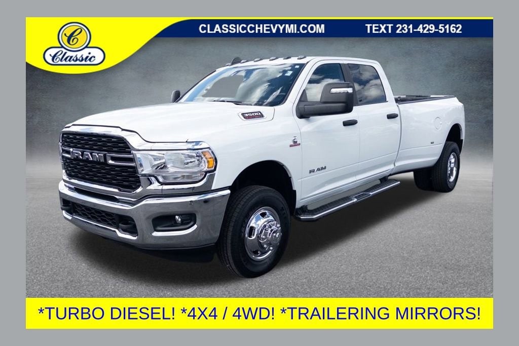 *TURBO DIESEL, *4X4 / 4WD, *TRAILERING MIRRORS, *TRAILER BRAKE CONTROLLER, *SPRAY IN BED LINER, *POWER DRIVER'S SEAT, *ASSIST STEPS / RUNNING BOARDS, *REAR VISION BACK UP CAMERA, *ALLOY WHEELS, *18 INCH WHEELS, *REMAINDER OF FACTORY WARRANTY, 2 Way Rear Headrest Seat, 2nd Row In Floor Storage Bins, 3.73 Axle Ratio, 4 Way Front Headrests, 4-Wheel Disc Brakes, 40/20/40 Split Bench Seat, 4G LTE Wi-Fi Hot Spot, 5th Wheel/Gooseneck Towing Prep Group, 6 Speakers, 6000# Front Axle w/Hub Ext, 8.4 Touchscreen Display, ABS brakes, Active Noise Control System, Air Conditioning, All R1 Low Radios, All Radio Equipped Vehicles, Apple CarPlay, Auto Power-Folding Mirrors, Black Exterior Mirrors, Bluetooth Handsfree Phone & Audio, Box & Rear Fender Clearance Lamps, Brake assist, Bumpers: chrome, Center Hub, Chrome Flat Cab-Length Side Steps, Clearance Lamps, Cloth 40/20/40 Bench Seat, Compass, Connectivity - US/Canada, Delay-off headlights, Driver door bin, Dual front impact airbags, Dual front side impact airbags, Dual Glove Boxes, Dual Rear Wheels, Electronic Stability Control, Electronically Controlled Throttle, Emergency communication system: SiriusXM Guardian, Exterior Mirrors Courtesy Lamps, Exterior Mirrors w/Heating Element, Exterior Mirrors w/Supplemental Signals, Foam Bottle Insert (Door Trim Panel), Footwell Courtesy Lamp, For Details Visit DriveUconnect.com, For More Info, Call 800-643-2112, Forward & Reverse Utility Lights, Front anti-roll bar, Front Armrest w/Cupholders, Front Center Armrest w/Storage, Front Center Seat Cushion Storage, Front Fog Lamps, Front License Plate Bracket, Front reading lights, Front Seat Back Map Pockets, Fully automatic headlights, Global Telematics Box Module (TBM), Glove Box Lamp, Google Android Auto, GPS Antenna Input, Heated door mirrors, Illuminated entry, Integrated Center Stack Radio, Integrated Voice Command w/Bluetooth, Leather Wrapped Steering Wheel, Level 1 Equipment Group, Locking Lower Glove Box, Low tire pressure warning, Manual Adjust 4-Way Driver Seat, Manual Adjust 4-Way Front Passenger Seat, Manufacturer's Statement of Origin, Mirror Running Lights, MOPAR Spray In Bedliner, Occupant sensing airbag, Outside temperature display, Overhead airbag, Overhead console, Panic alarm, ParkView Rear Back-Up Camera, Passenger door bin, Passenger vanity mirror, Power Adjust 8-Way Driver Seat, Power Adjust Mirrors, Power door mirrors, Power Heated Fold Telescopic Mirrors, Power steering, Power Telescoping Mirrors, Power windows, Power-Adjustable Convex Aux Mirrors, Premium Cloth 40/20/40 Bench Seat, Quick Order Package 2HZ Big Horn, Radio data system, Radio: Uconnect 3 w/5 Display, Radio: Uconnect 5 w/8.4 Display (DISC), Rear 60/40 Folding Seat, Rear Dome w/On/Off Switch Lamp, Rear Folding Seat, Rear seat center armrest, Rear step bumper, Rear Wheelhouse Liners, Remote keyless entry, Remote USB Port - Charge Only, Selectable Tire Fill Alert, SiriusXM Radio Service, SiriusXM Satellite Radio, Speed control, Steering Wheel Mounted Audio Controls, Storage Tray, Tachometer, Tilt steering wheel, Tip Start, Traction control, Trip computer, Turn signal indicator mirrors, Variably intermittent wipers, Voltmeter, Wheels: 17 x 6.0 Steel Chrome Clad, Wheels: 18 x 8.0 Polished Aluminum, Wheels: 18 x 8.0 Steel Chrome Clad.